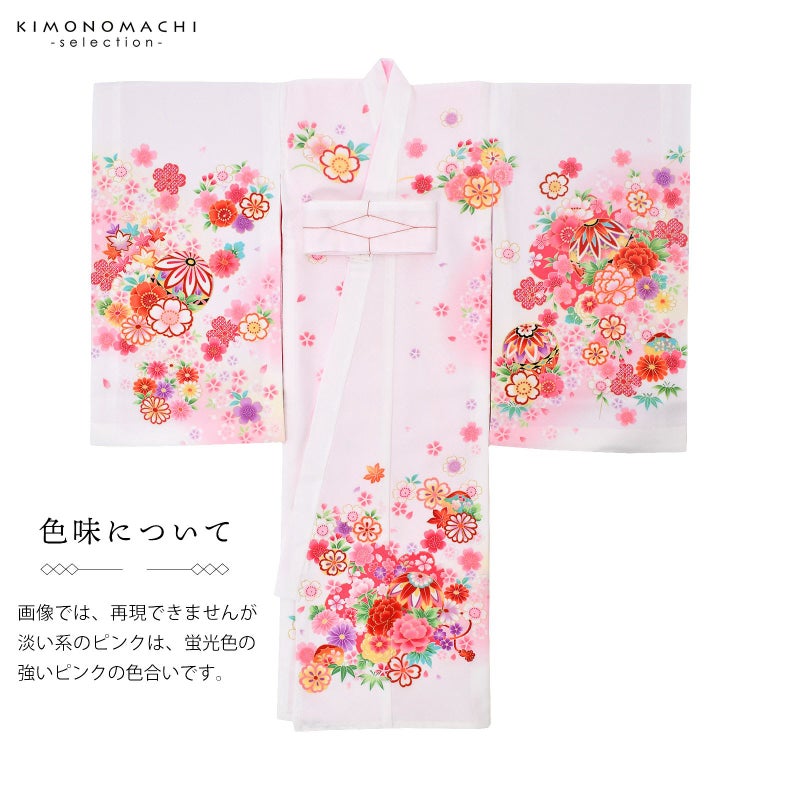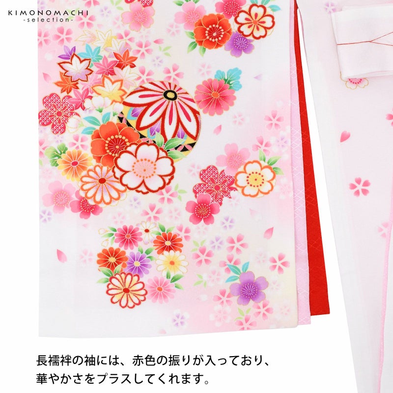 高級感がありつつも、女の子らしく可愛らしい雰囲気。美しい発色の生地に美しい模様。長襦袢の中に赤色の振りが入っており、華やかさをプラスしてくれます。細部に至るまで、こだわったお品です。