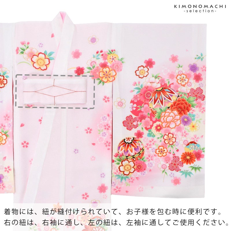 着物には紐が縫い付けられていて、お子様を包む時に便利です。右の紐は右袖に通し、左の紐は左袖に通してご使用ください。