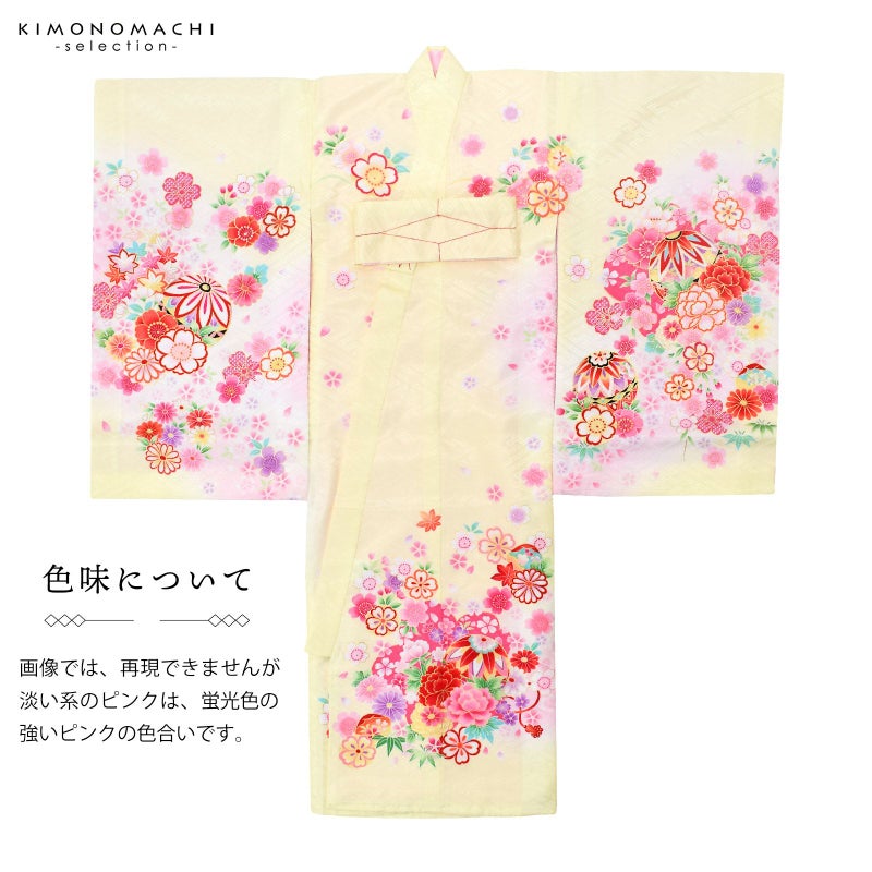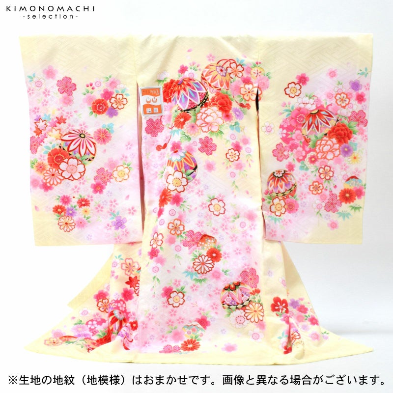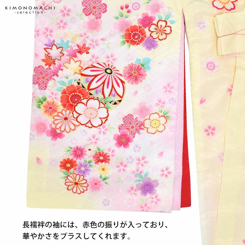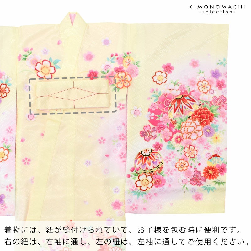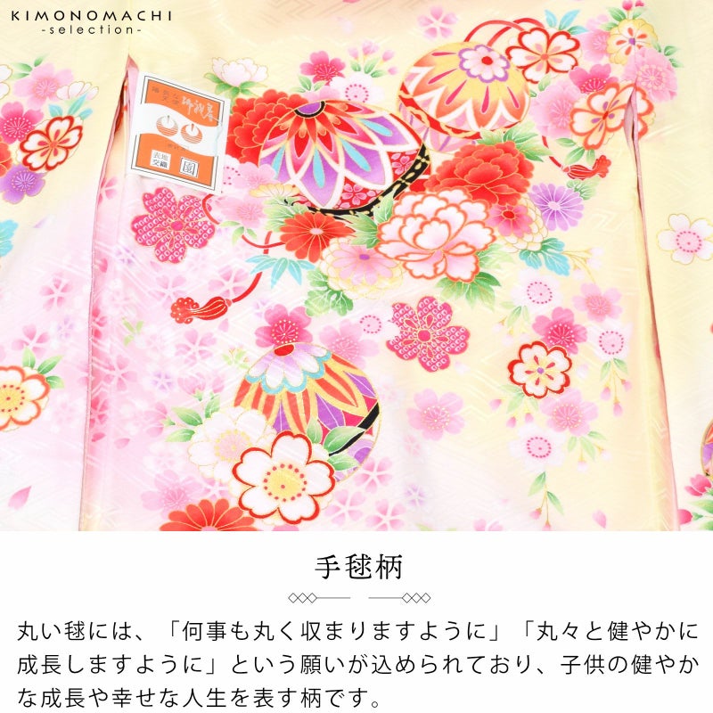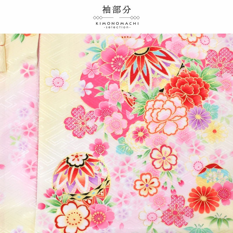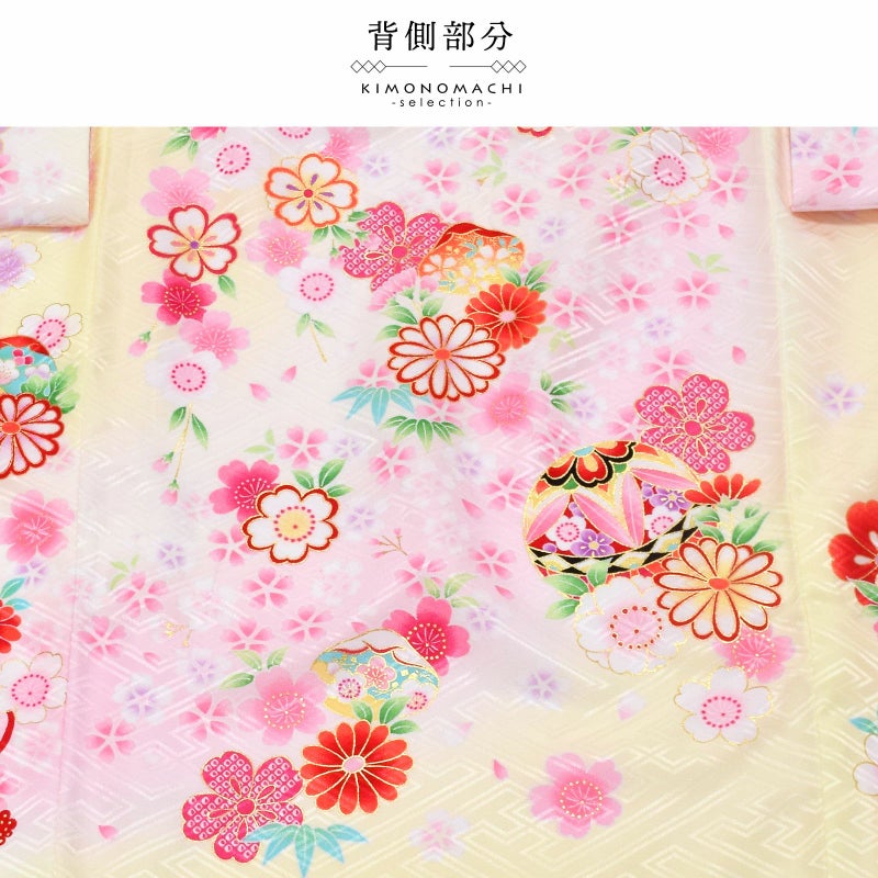 淡く明るい黄色の地に淡いピンク色のぼかしの流線。赤や紫、ピンク、薄黄色、橙色に黒などの手鞠に赤い組み紐。牡丹に菊、桜の花々。花紋をあしらった貝合わせ文。ポイントの金彩が輝きを添えます。襦袢は薄ピンク。振りは赤。