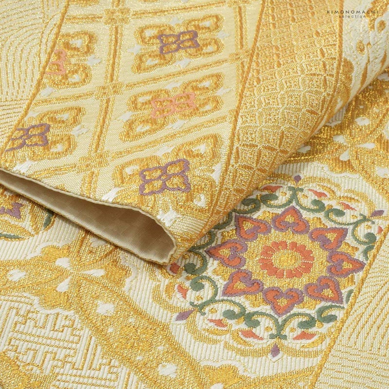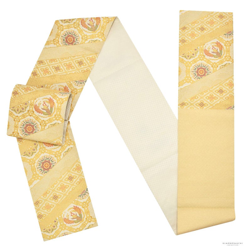 【色柄】輝きのある金とアイボリーが美しい帯地に、鳳凰と唐花が豪華絢爛な袋帯。鳳凰と唐草文様の一種である宝相華が豪華に織り上げられており、気品と風格があります。幸菱や波文様も、ゴールドととても良く調和しており豪華絢爛たる気品がある帯です。