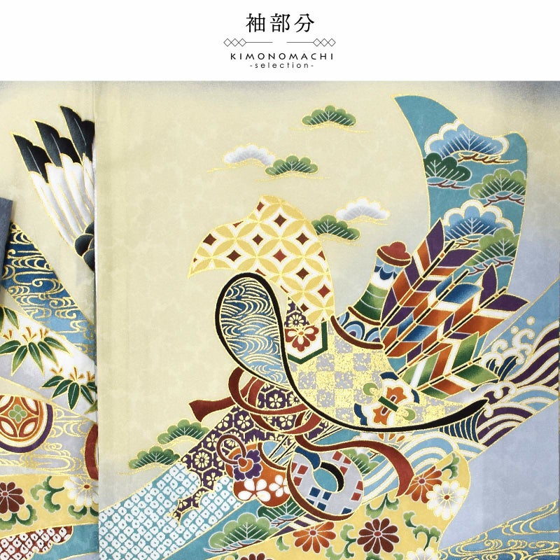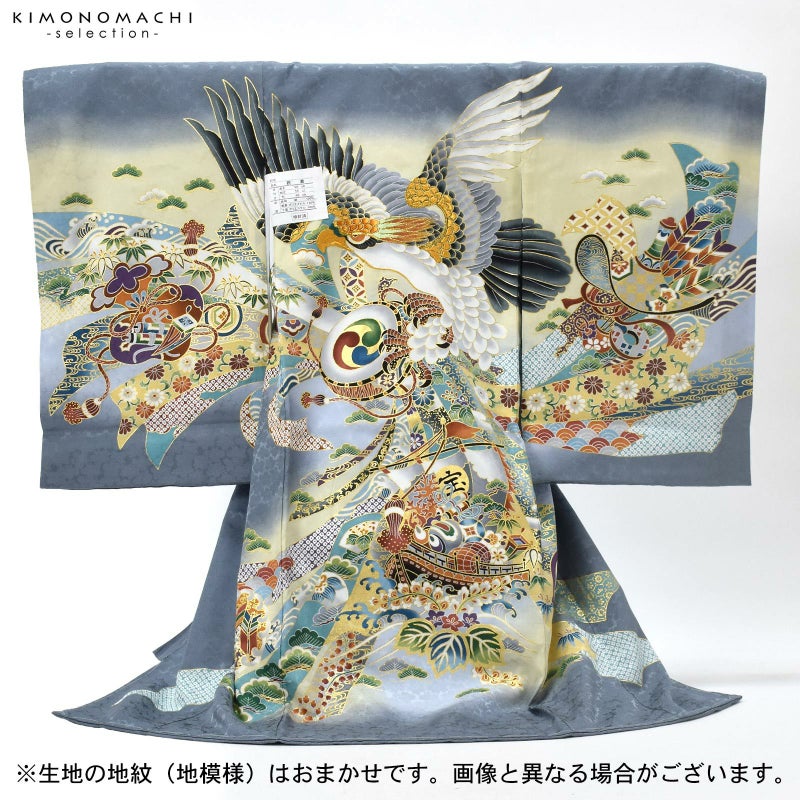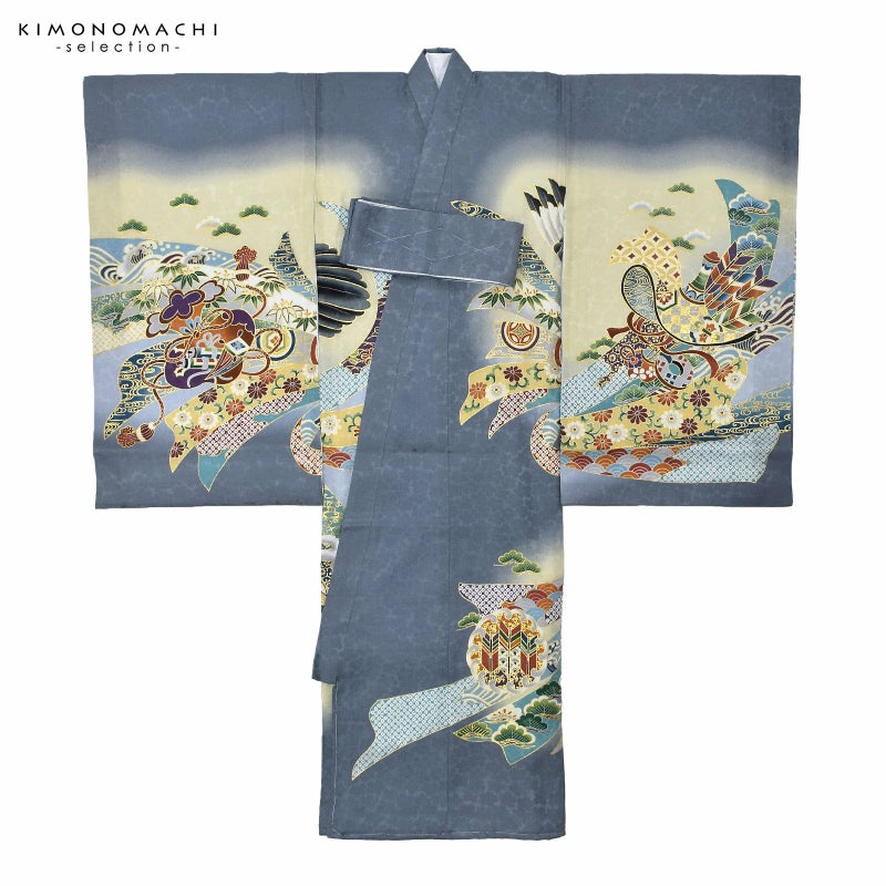 着物は地模様のある灰色の地に淡い灰緑色の腰替わり。背には鉄紺や青灰色、白の翼を広げた鷹。金彩や刺繍が上品な煌びやかさを添えています。茶色に青、緑、黒、海老茶色など多彩な色使いの太鼓や宝船。さらに吉祥文様を入れた薄灰色や浅葱色の束ね熨斗。襦袢は白。袖の振りは淡い水色。