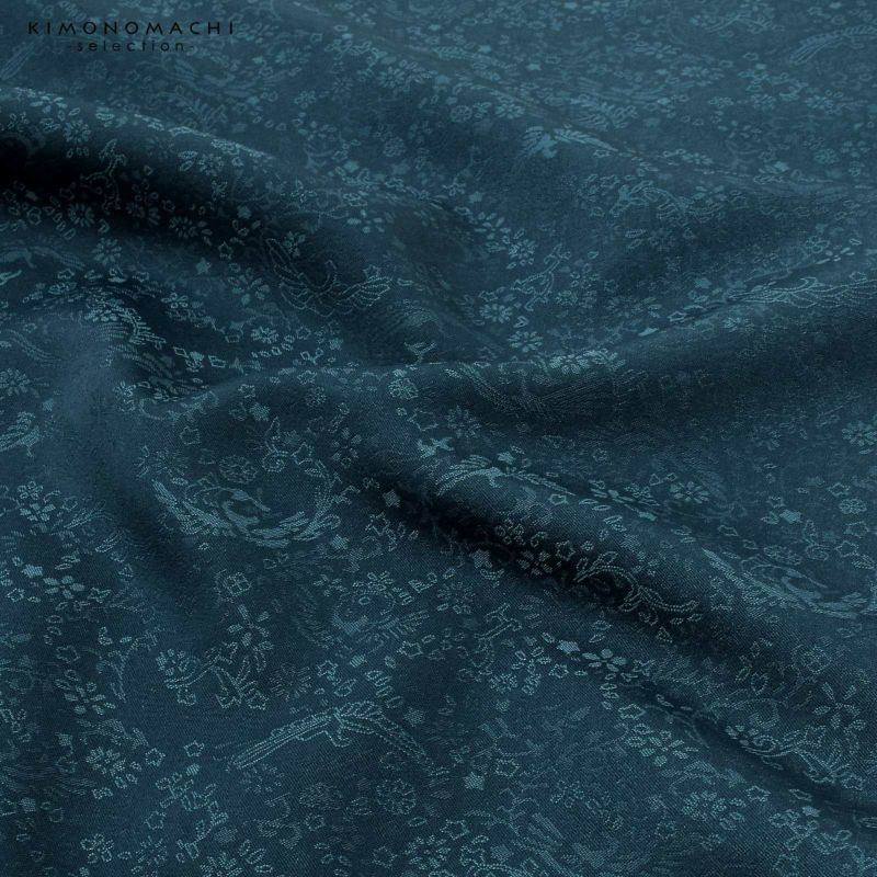 色は深い藍色。織りで表現された小花に鳥の地模様が、光の当たり具合や着る人の動きによって浮かび上がります。