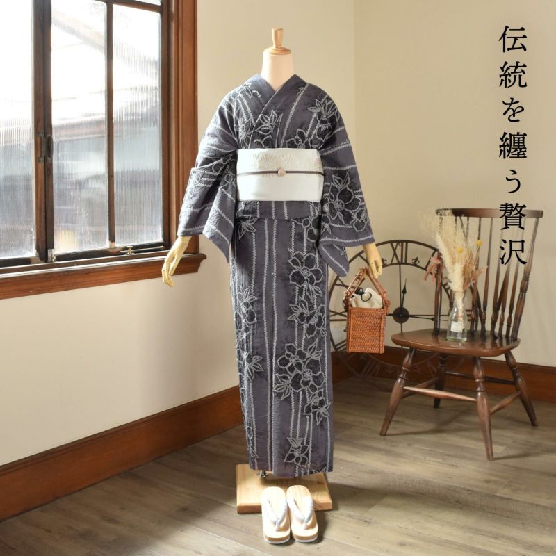 大人のお洒落な絞りの浴衣単品です。お仕立て上がりなので、すぐにご着用いただけます。絞りがやわらかで肌触りがよく、生地の凹凸があることで、肌にはり付きにくく、さわやかな着心地です。盆踊り、夏祭りにはもちろん、襦袢を合わせてちょっとしたお出かけにも、踊りなどのお稽古にもいいですね。