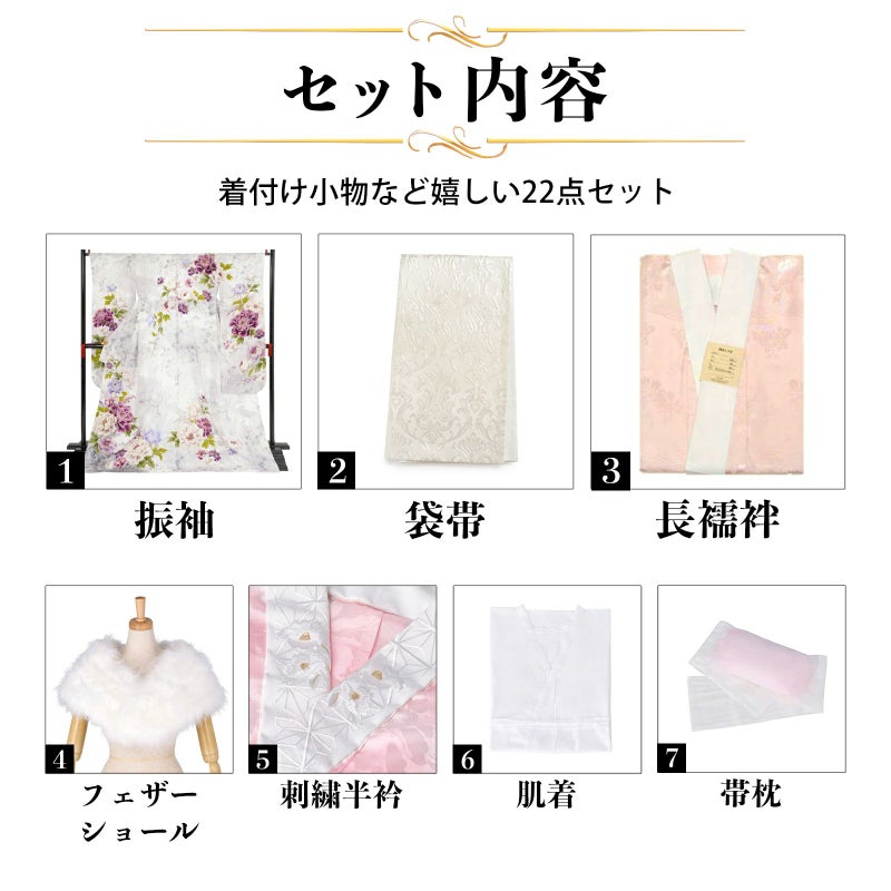 【商品内容】振袖(仮絵羽・未仕立て)、袋帯(未仕立て)、長襦袢(未仕立て)、ショール、刺繍半衿、肌着、帯枕、帯前板、帯後板、衿芯、伊達締め2本、コーリンベルト、三重仮紐、腰紐6本、足袋、着物ハンガー、振袖お仕立て、帯お仕立て、襦袢お仕立て、半衿縫い付け、胴裏正絹、長襦袢正絹の計22点セット