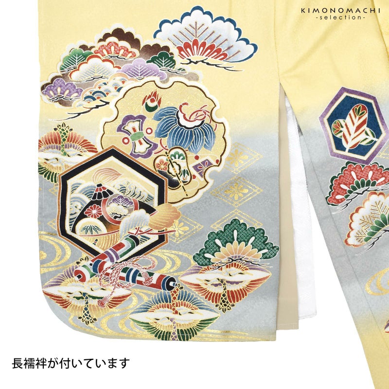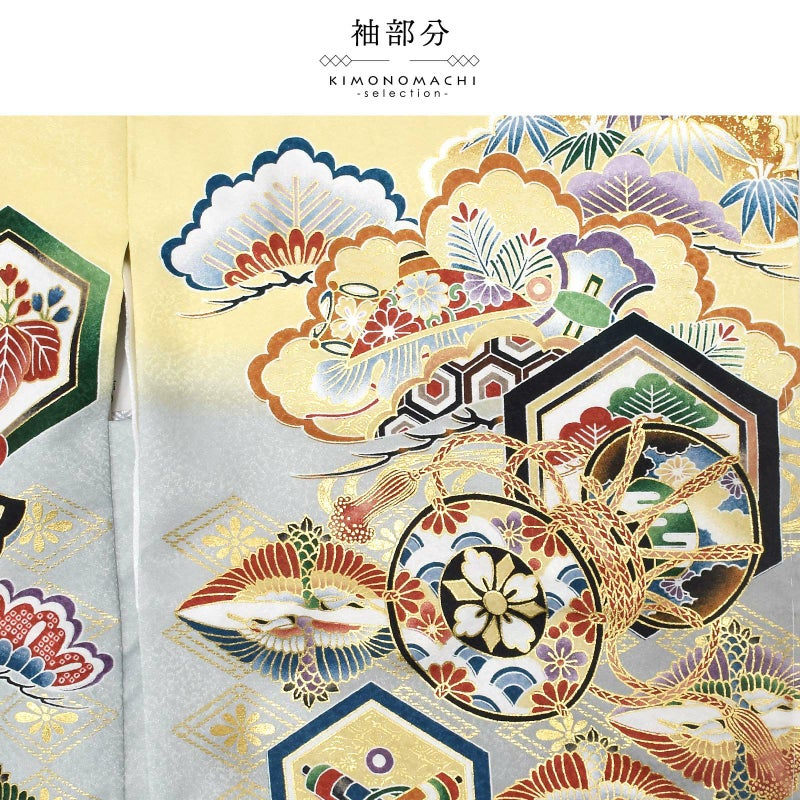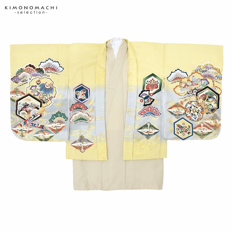 羽織は細かな地模様のある明るいイエローベージュの地に、淡い青みの灰色の腰替わり。背には黒や赤茶、薄黄色などの兜が表現されています。ポイントに金の刺繍。紺や緑、錆朱の松、亀甲文、鶴菱に金彩の花菱や流水が煌びやかさを添えています。着物はベージュ。白の襦袢がついています。