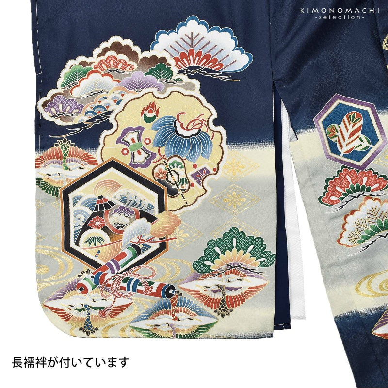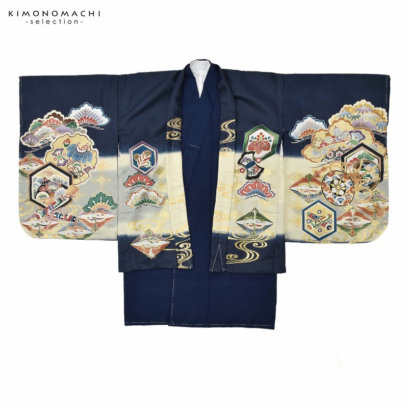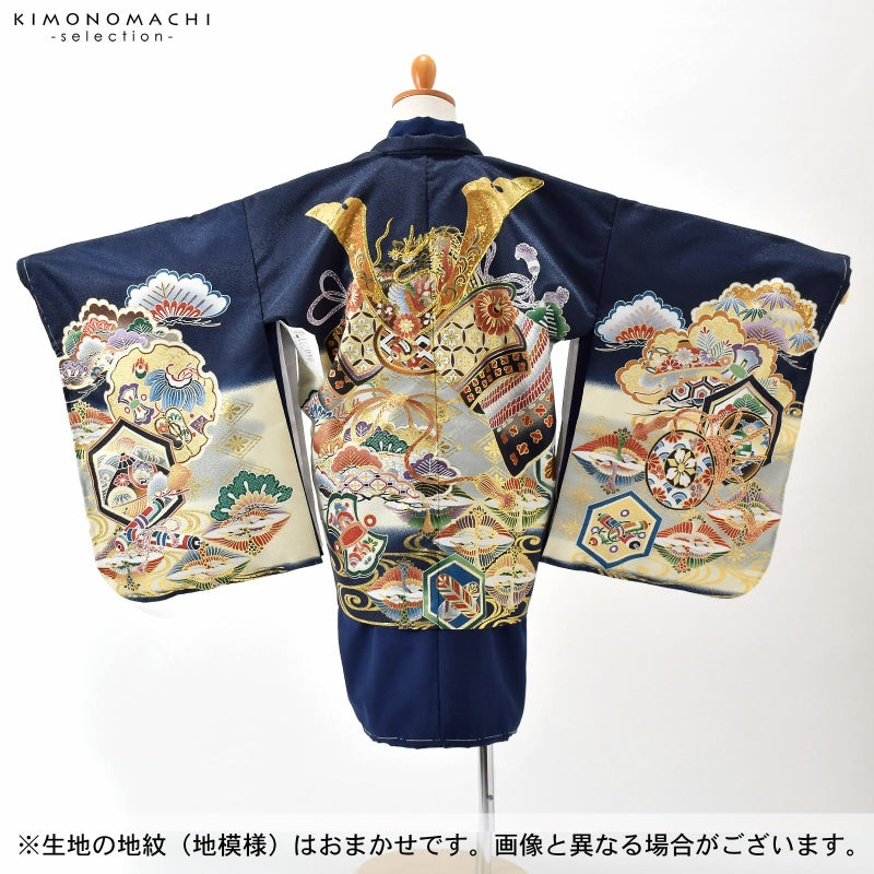 七五三 着物 男の子 3歳~5歳 羽織・着物アンサンブル「墨紺 兜に松、鶴菱」5才 3才向け 着物セット 男児用 子供着物 三才 五才のお祝い着【メール便不可】