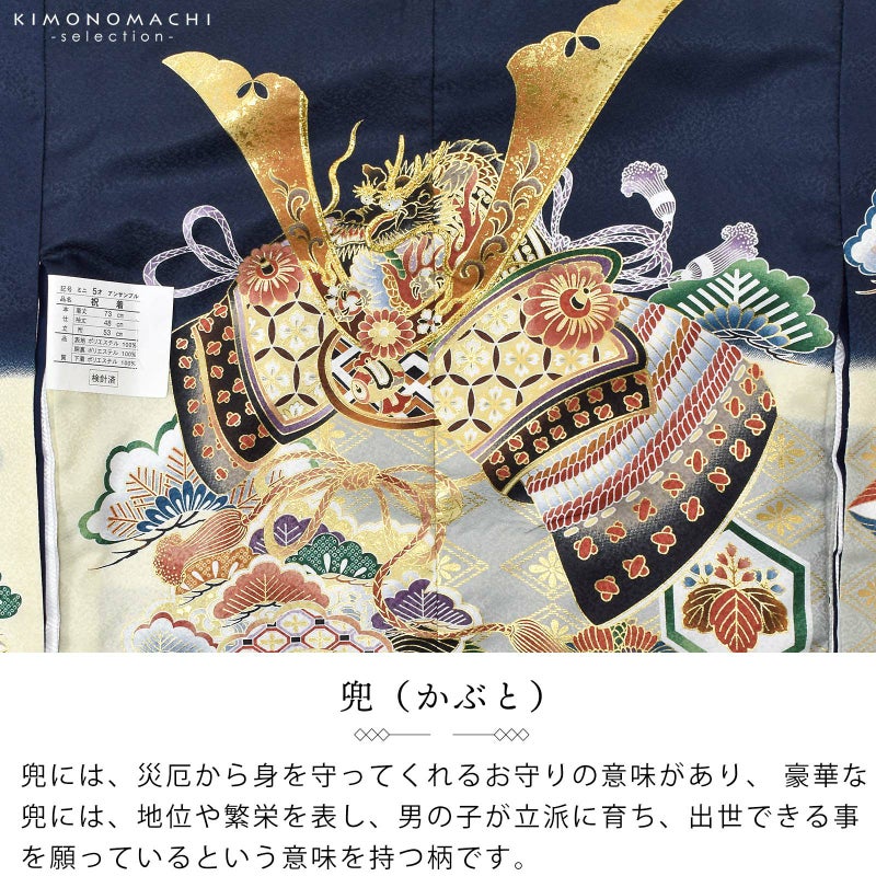 七五三 着物 男の子 3歳~5歳 羽織・着物アンサンブル「墨紺 兜に松、鶴菱」5才 3才向け 着物セット 男児用 子供着物 三才 五才のお祝い着