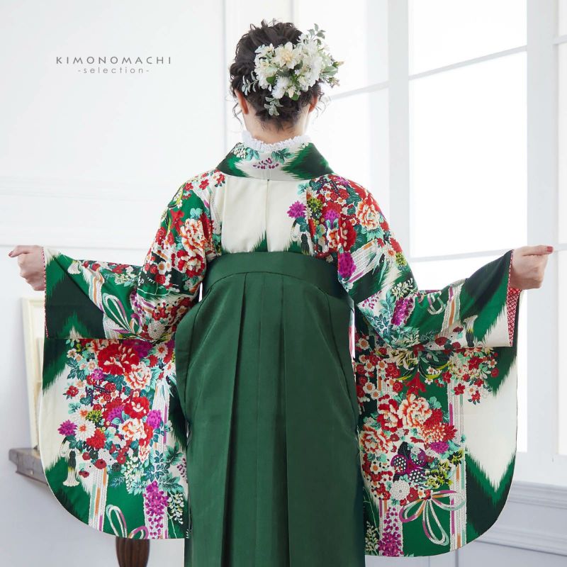 袴 セット 卒業式 女性 4点セット「二尺袖:九重 アイボリー×緑 矢絣に花籠+袴:緑色+袴下帯:レッド 麻の葉+襦袢」レディース 袴セット 二尺袖着物セット 着物 卒業 二尺袖 袴【メール便不可】
