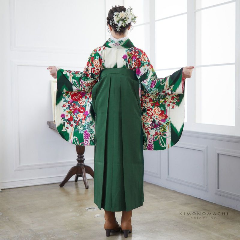 5. 袴 セット 卒業式 女性 4点セット「二尺袖:九重 アイボリー×緑 矢絣に花籠+袴:緑色+袴下帯:レッド 麻の葉+襦袢」レディース 袴セット 二尺袖着物セット 着物 卒業 二尺袖 袴【メール便不可】