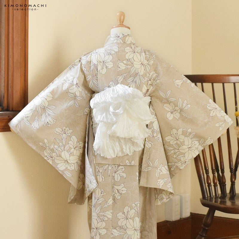 110cm、120cm、130cmの浴衣には着付け用に紐が縫い付けられていて、身あげ、肩上げがされています。140cm、150cmは大人と同じように着付けていただく仕様です。