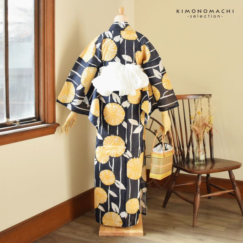 3. 浴衣 レディース 単品 お仕立て上がり浴衣 プレタ「紺地 黄の花」Fサイズ シック 大人 モダン 粋 ゆかた 女性 ブランド ブランド浴衣 花火大会 夏祭り 綿麻浴衣<H>【メール便不可】