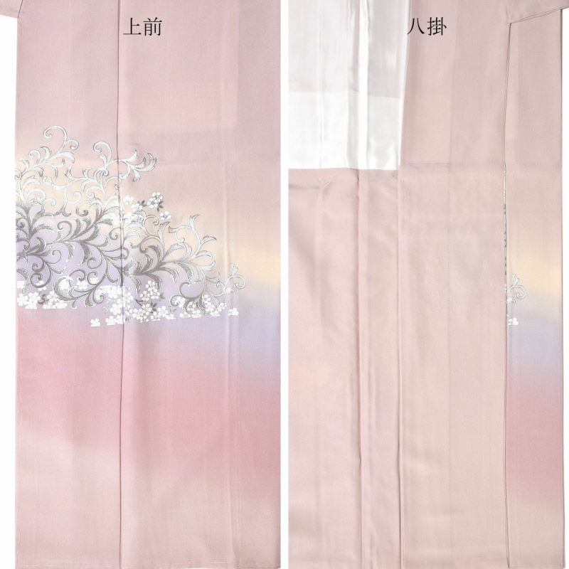 灰桜色に淡いベージュや藤色、薄桃色のやわらかいぼかしの地。銀彩に白、緑の桜花にラメ感のある銀彩の唐草文様が飛び柄で配置されています。上品さと個性を合わせ持った訪問着です。