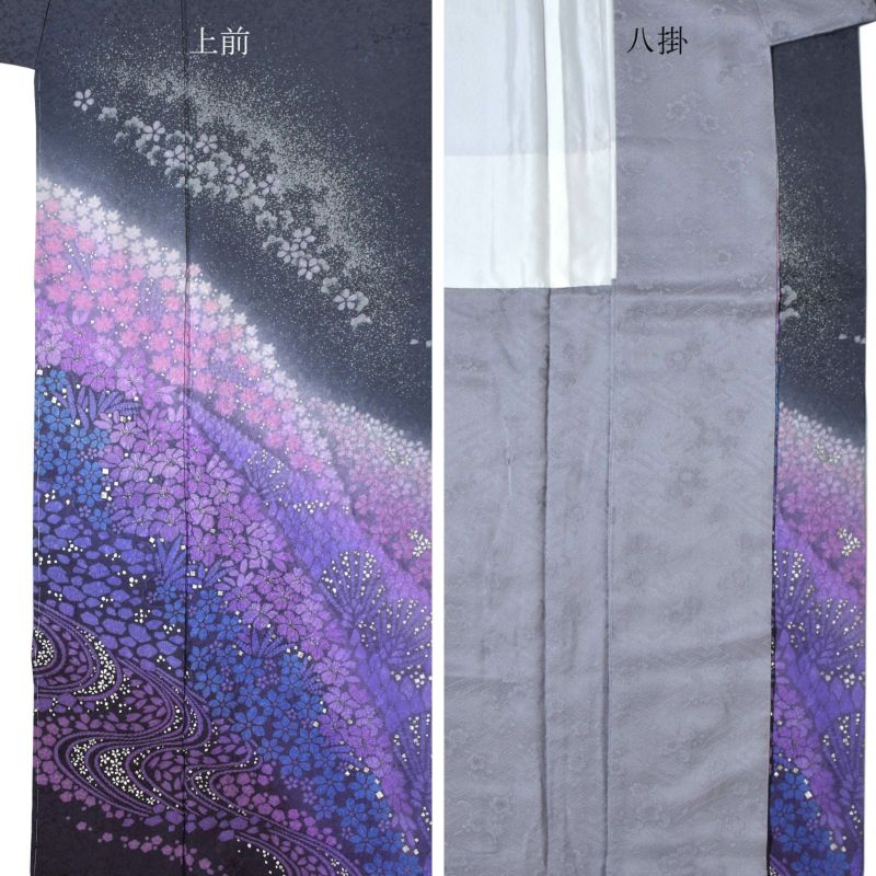 細かな地模様のある生地。墨色の地に右袖から背にかけて弧を描くように青みのグレーで染め分けられた地。グレーの滝に沿ってグレーや牡丹鼠色の桜。裾には流れるような配置で紫、ピンク、青藤色、浅い赤紫色の桜の花々が密に表現されており、まるで花筏のよう。ポイントの金彩が控えめな煌びやかさを添えています。