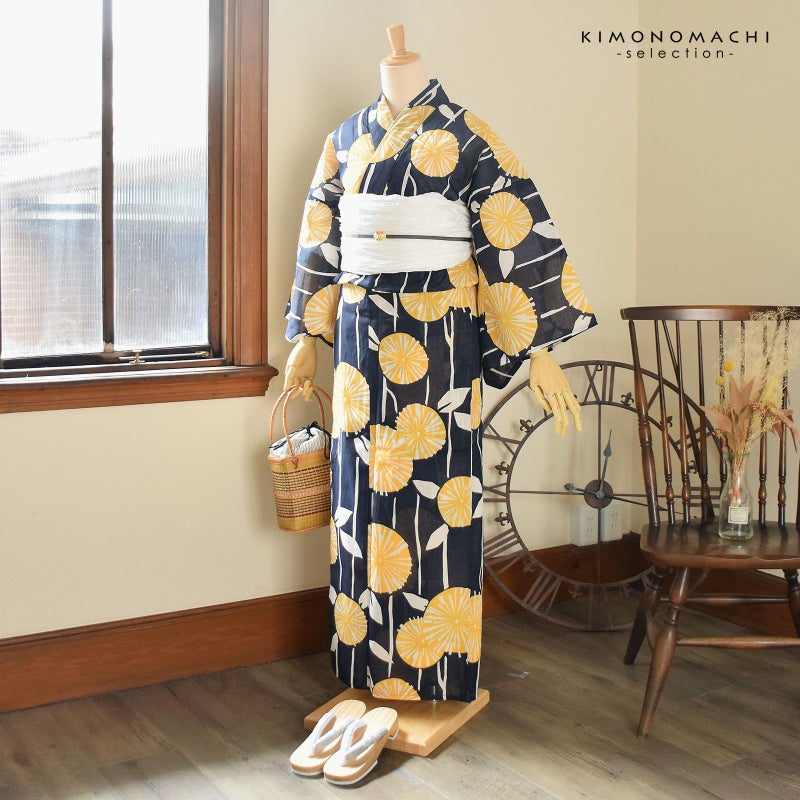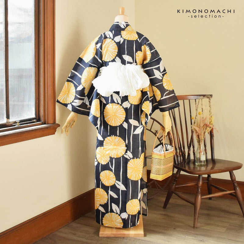 浴衣:生成り色と白の細かな縦縞の生地。深い紺地に縦縞に配置された染め抜きの茎と葉。黄色の丸いお花。シンプルで古典的な雰囲気と、大胆な印象を合わせ持ったデザインです。