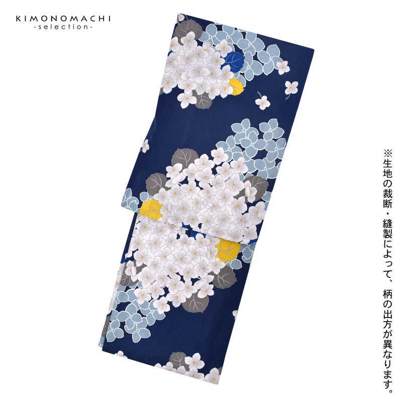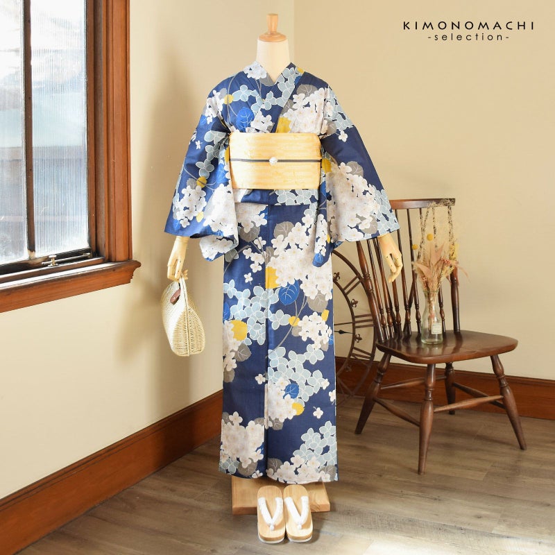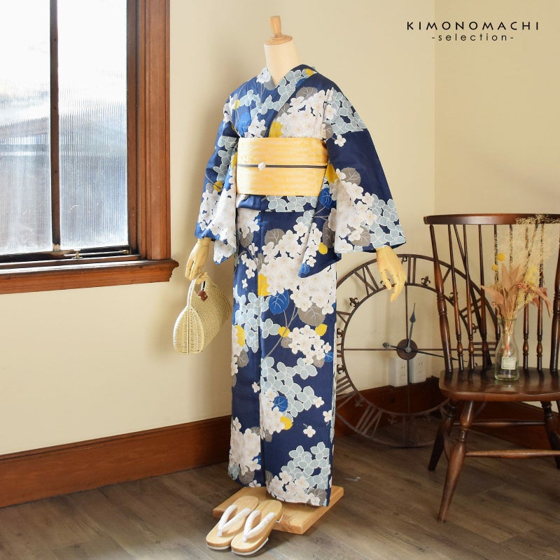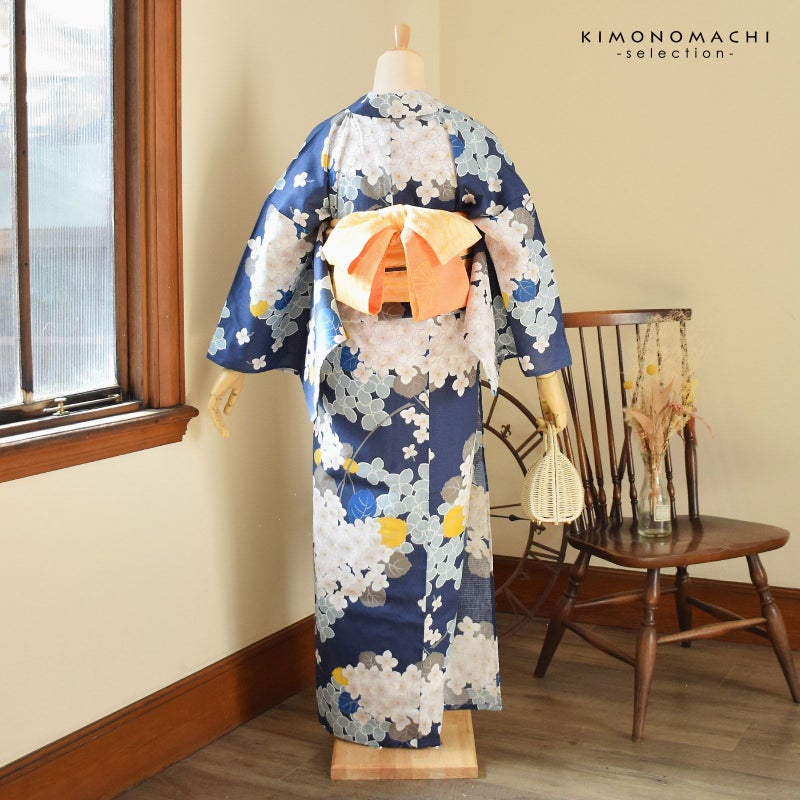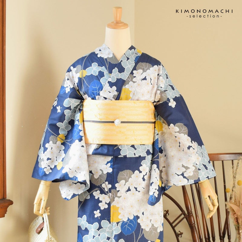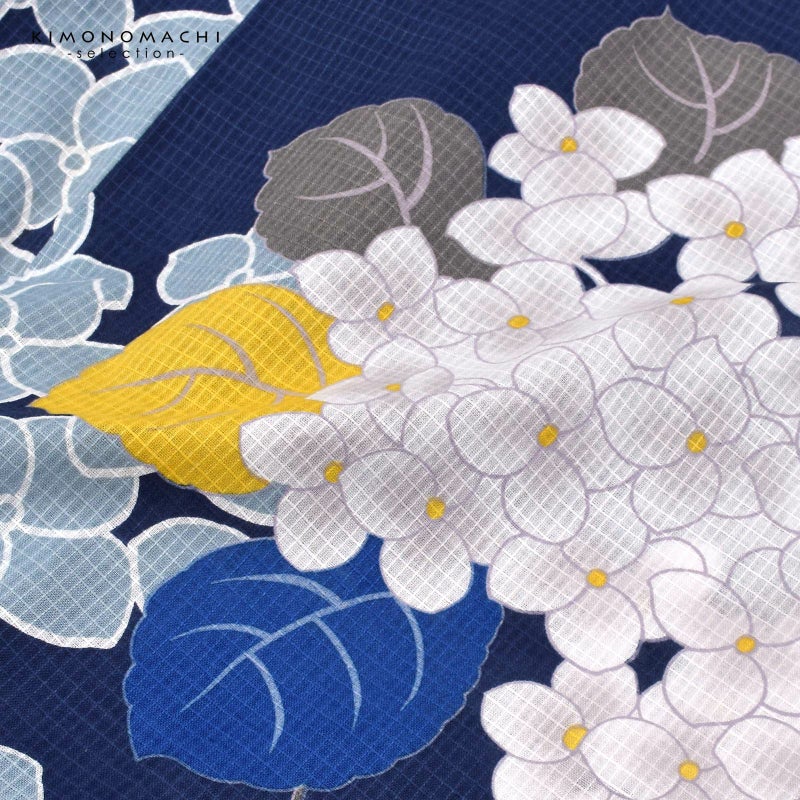 浴衣:深い青藍色の地、白に淡いグレーぼかしの小花に黄色の蕊のアジサイ。グレーの葉や茎、挿し色として黄色やブルーの葉。白い輪郭線にブルーグレーの花。落ち着きの中にかわいらしさを感じさせます。