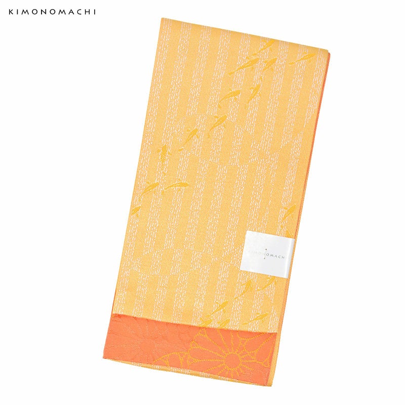帯:表は明るい薄い黄色に変わり縞と小魚の模様。裏は明るい浅いめのオレンジ色の菊花の斜め段模様。