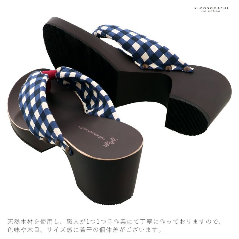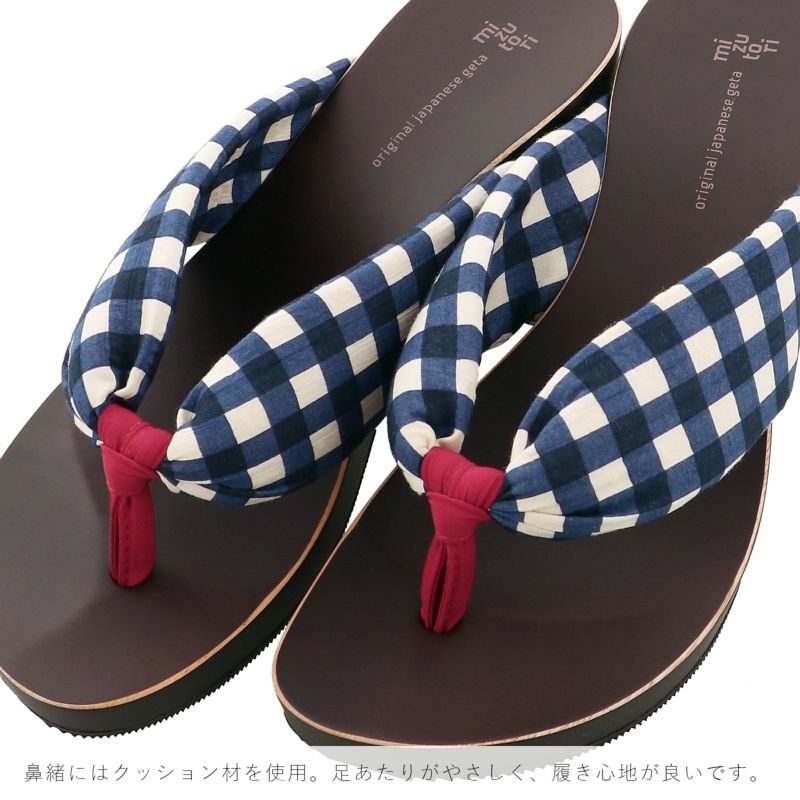 足形に添ったカーブがついたヒールタイプの台。台の色は自然な深い茶色、エッジは白茶。幅広の鼻緒は、波打ったような生地のオフホワイトと紺のギンガムチェック。前坪はワイン。