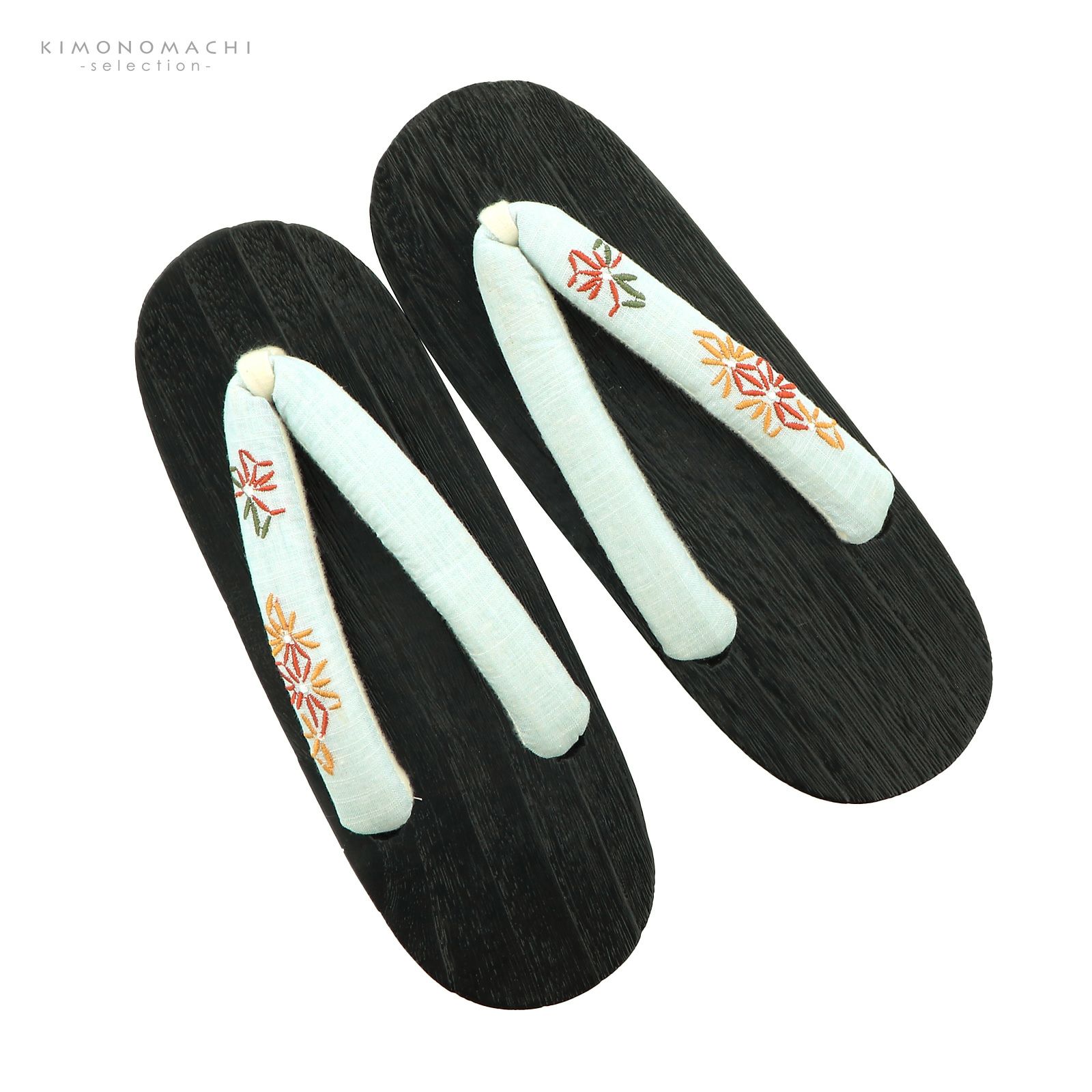 【色柄】鼻緒はややグレイッシュな薄水色の地に赤や橙色、深緑色の小菊のような花火の刺繍。前坪はオフホワイト。台は黒。