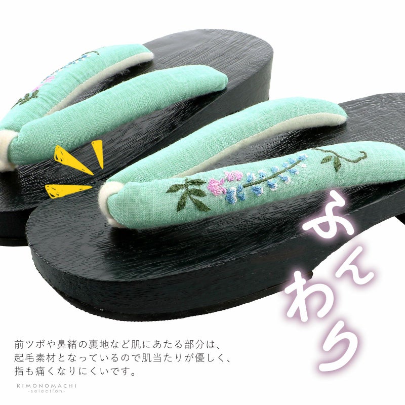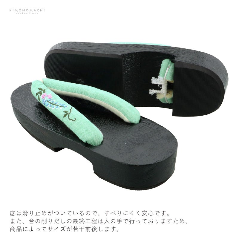 【色柄】鼻緒は淡いミントグリーンの地に水色やピンク、深緑色の藤の花の刺繍。前坪はオフホワイト。台は黒。