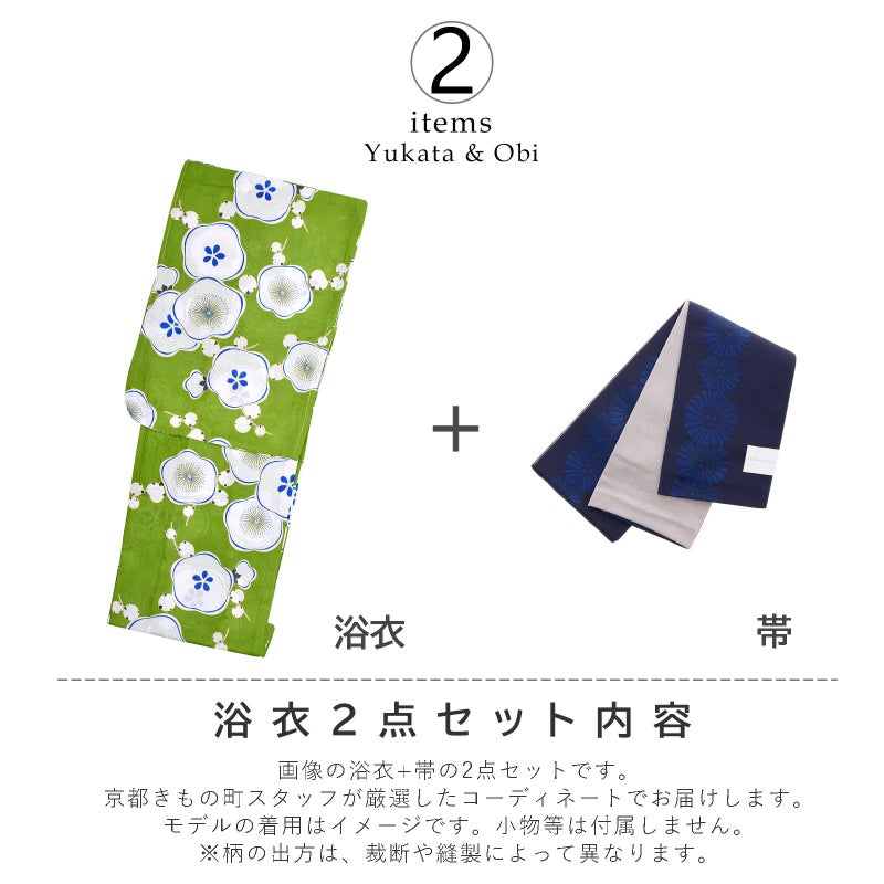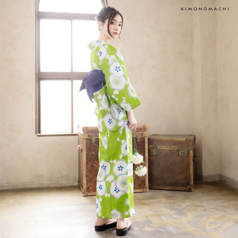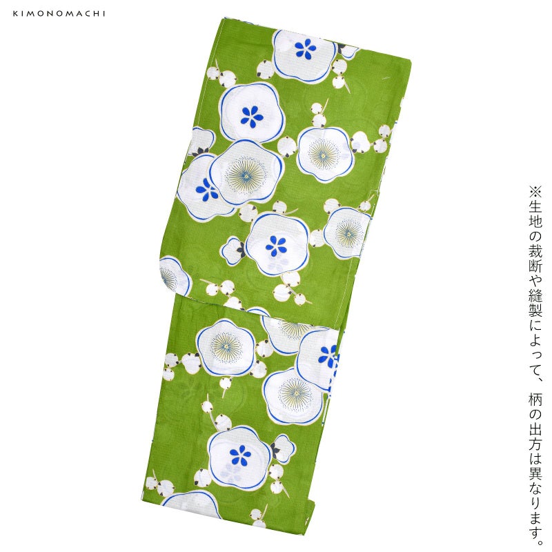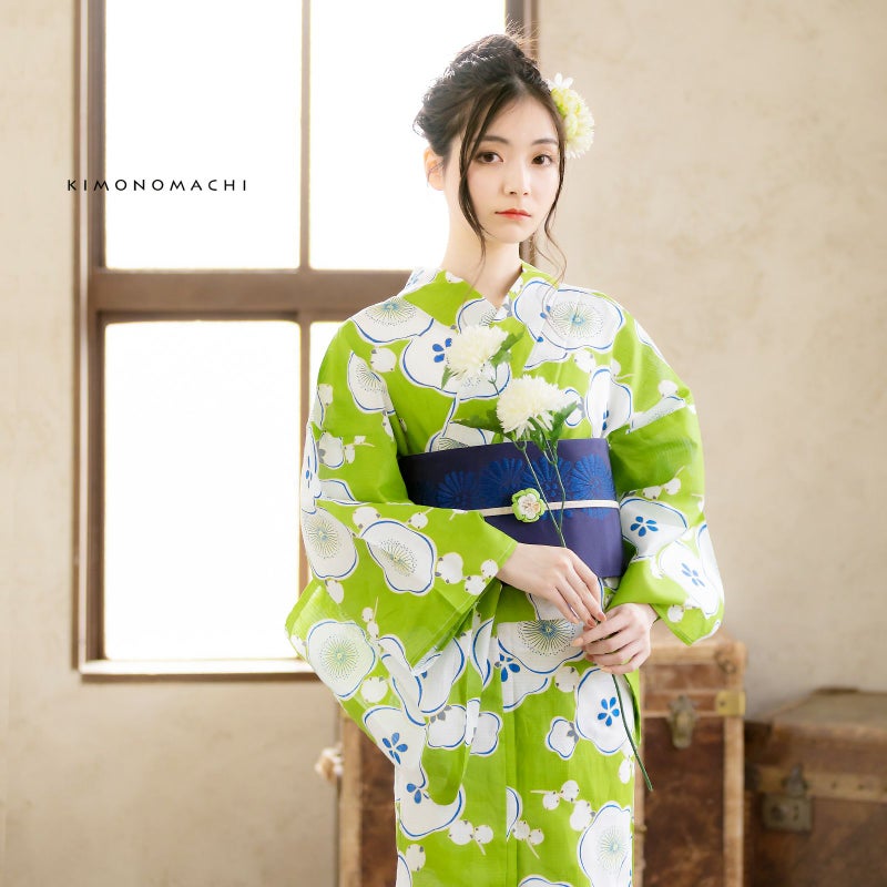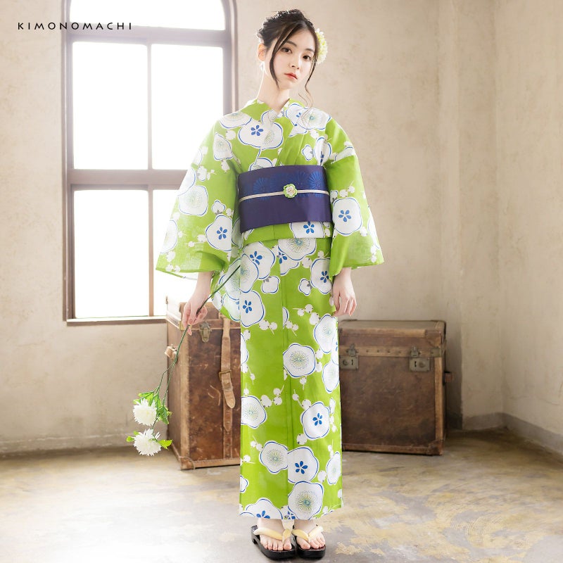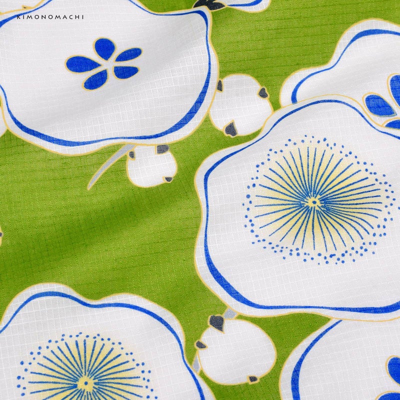 浴衣:濃い黄緑地に柔らかな丸みと曲線のある白い梅の花。花の部分には鮮やかな濃い青色のラインや、ところどころ色づいた黄色が使われています。花の間から少しだけ覗く枝の部分は薄いグレー。