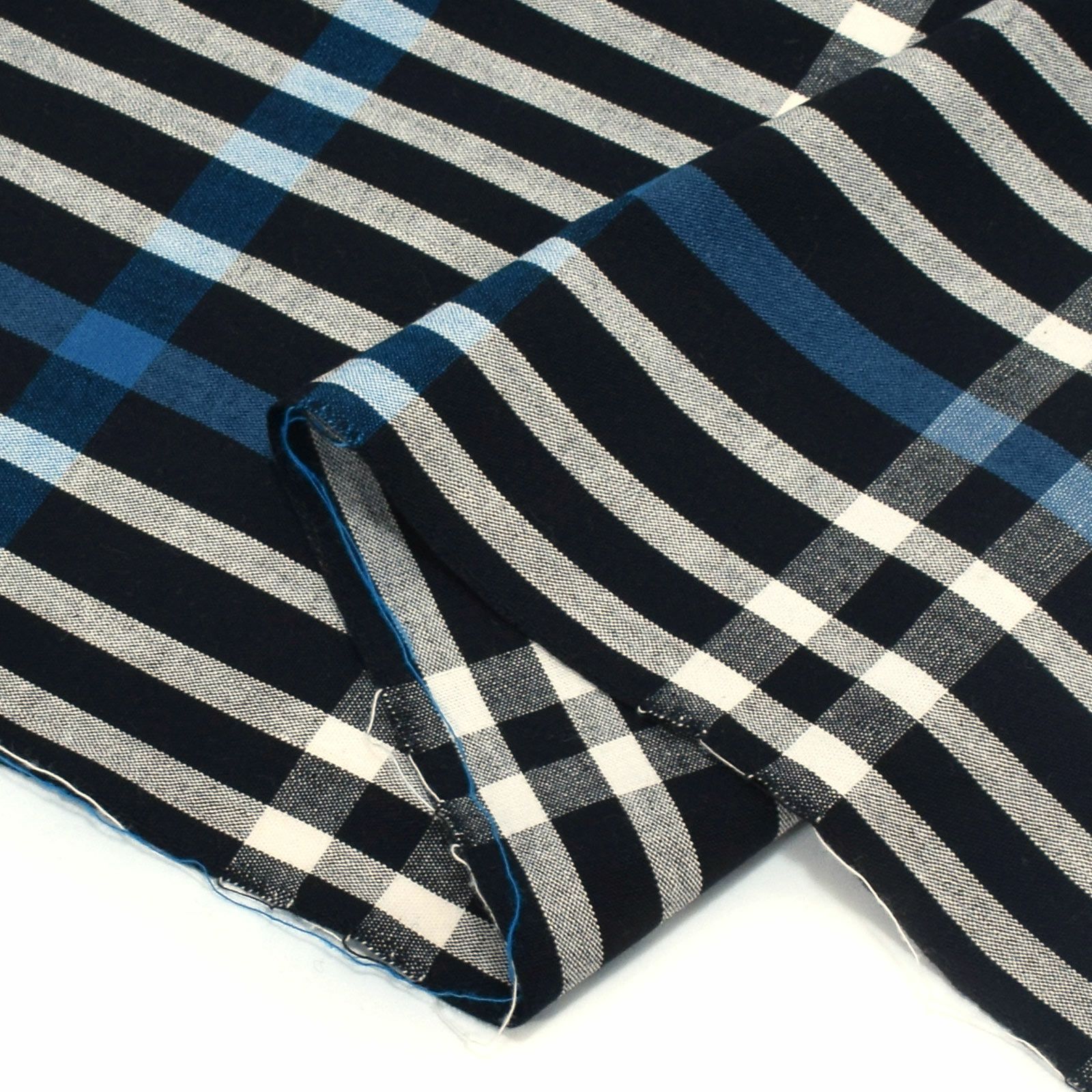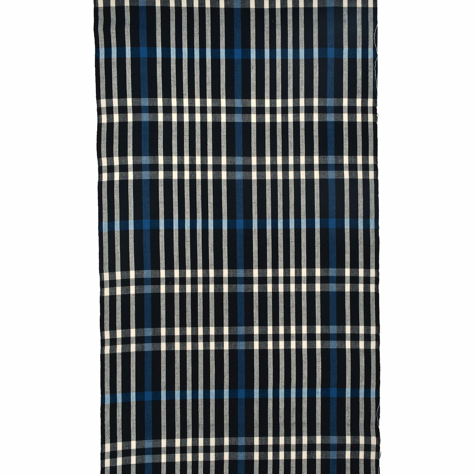深い紺色地に青、白の縞に、浅い白の横線を組み合わせた縦長の格子。大人っぽい配色で、長めの間隔の格子がスッキリと見せてくれます。