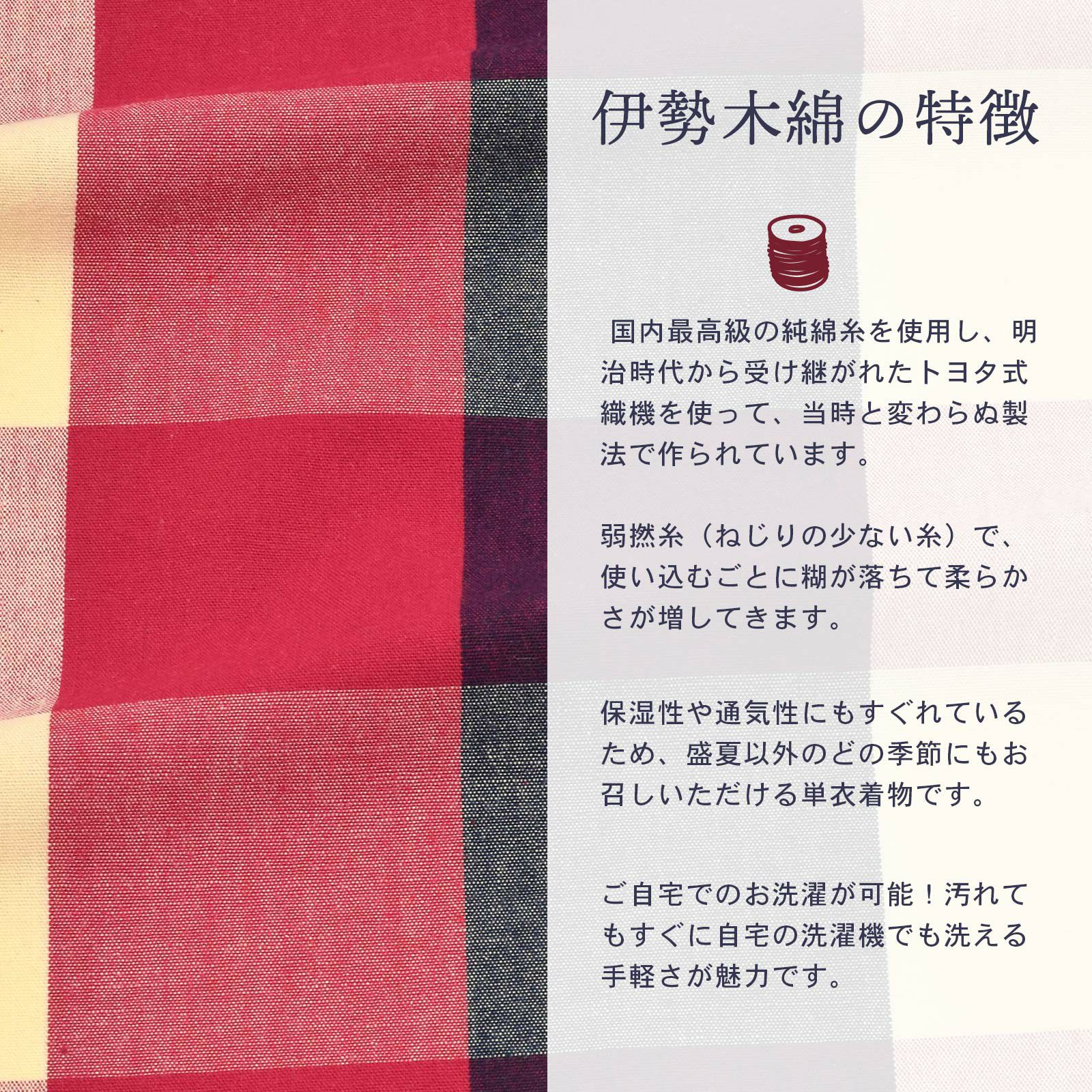 ゆっくりと時間をかけて丁寧に織り上げられた伊勢木綿の優しく素朴な風合いを、ぜひ肌で感じ取ってください。