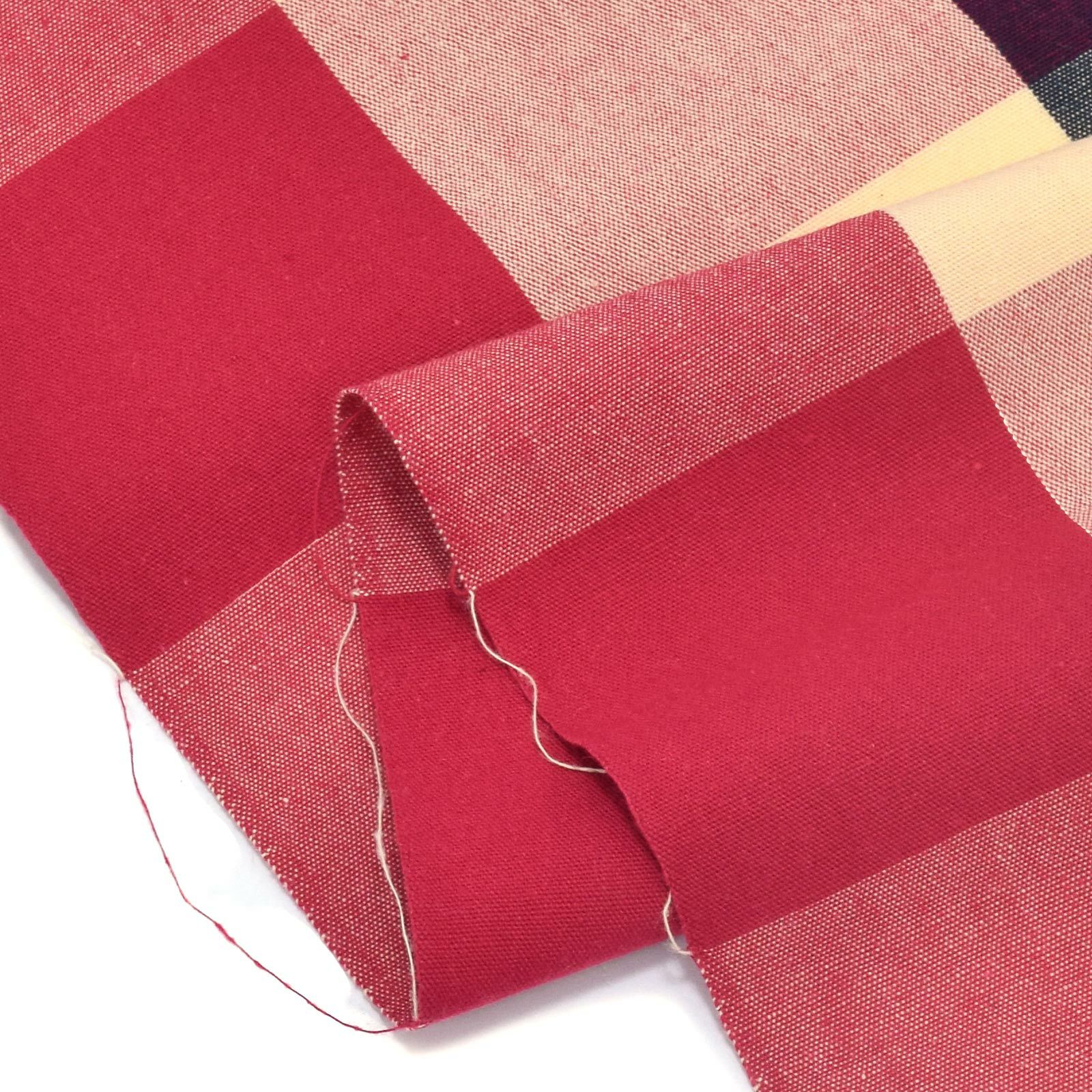 淡いたまご色、ピンクみの赤紫色、浅い紺色を重ねた約6~7cm角ほどのブロックチェック。格子の重なる部分が深い色となっており、しっとりとした奥行を感じさせます。