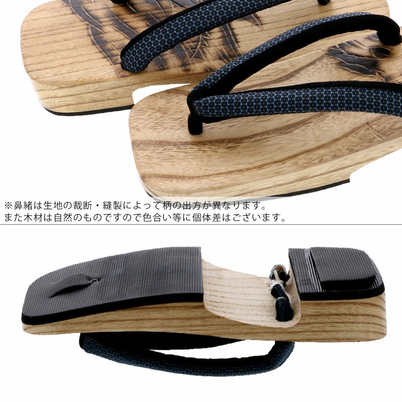 【色柄】白木の木彫の台、焼き加工を施した龍。左右で一繋がりになる柄です。鼻緒は黒と藍色の細かな亀甲絣。裏地、前坪は黒。