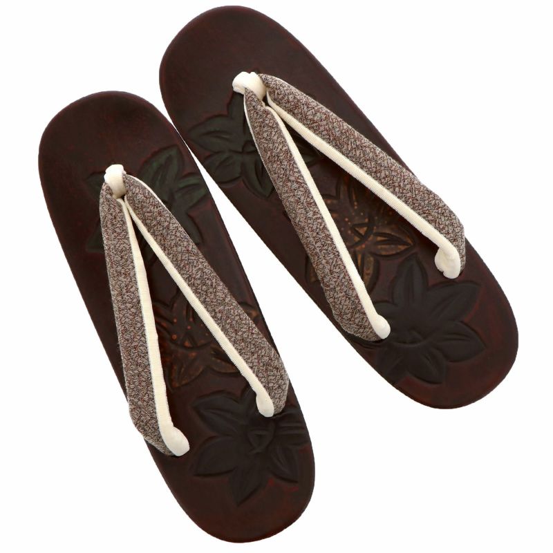 【色柄】深い赤みの茶色の鎌倉彫の台。緑や黄色、黒の鉄線花の柄。鼻緒はこげ茶色に赤、緑の紬調の生地。前坪と裏地はアイボリー。