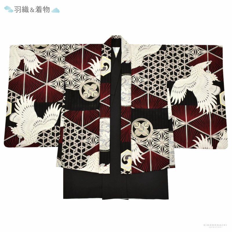 羽織は黒地にシルバーのピンストライプの地。グレージュのラインで菱形に分けられた中に、籠目や麻の葉、深い赤の松菱調の文様。白にグレーの白鷹に金彩、違い鷹の羽の丸紋。着物は黒、襦袢は白。袴はこげ茶色地に黒の菱文。共布の帯。白にメタルパーツやビーズの羽織紐。