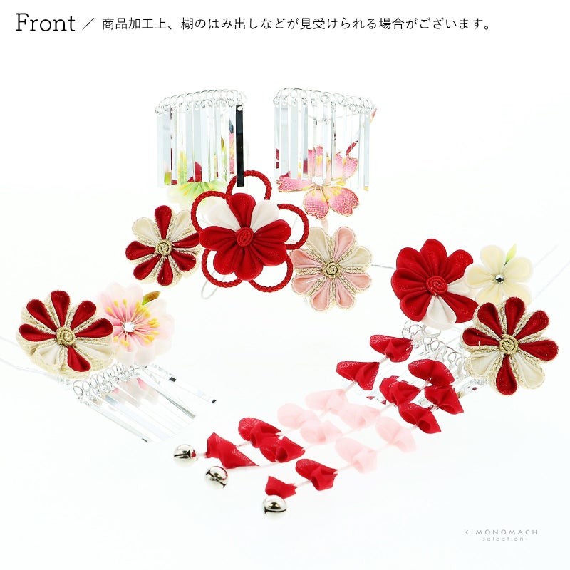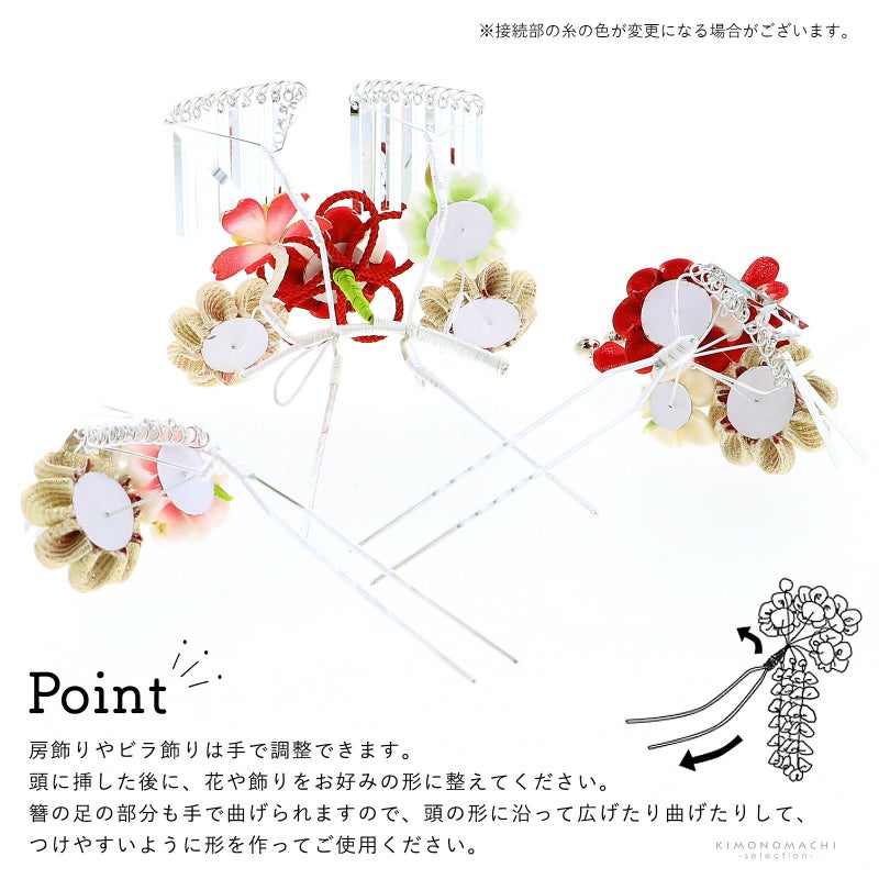 ◇かんざしの足は、お子様の頭に沿うように曲げてご使用ください。また、お花、房飾り、ビラカン等のパーツは多少動かせますので、髪型に合わせて調整してください。