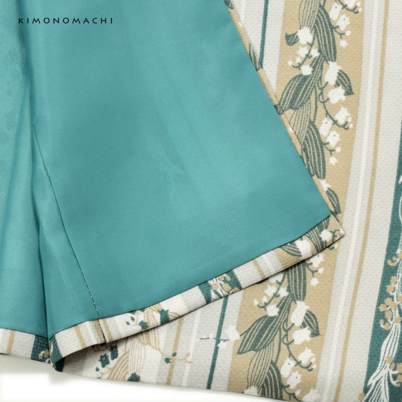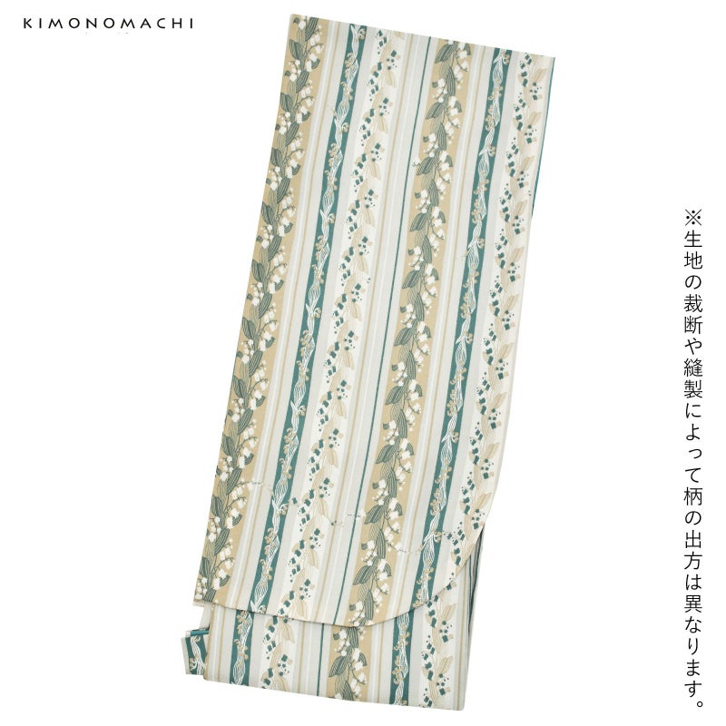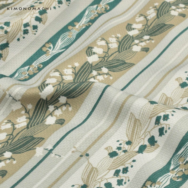 細かな地模様のある生地。淡いグレー地にオフホワイト、黄みのベージュと青緑色の縦縞の中に、抽象的に表現された大小のスズランの連続模様が配置されています。かわいらしいスズランを更紗縞風に構成した、和洋の魅力を兼ね備えたデザインです。裏地は浅い青緑。