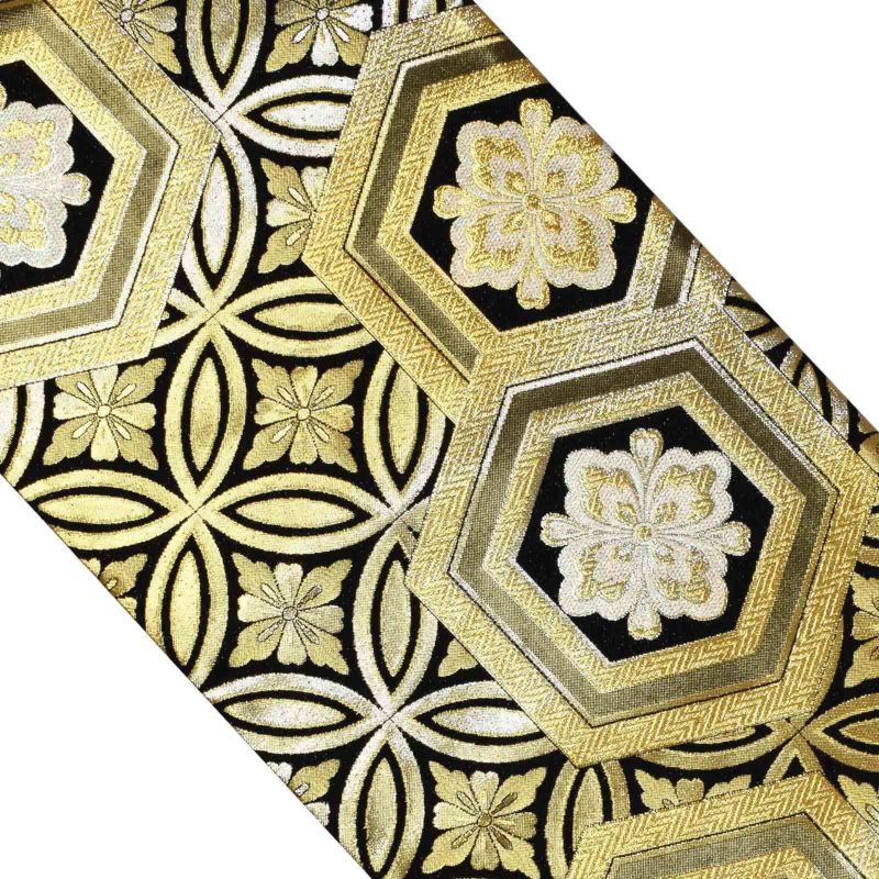 【色柄】黒地にゴールドや白金で表現された花菱七宝文様。その上に白い唐花の入ったゴールドの亀甲文。