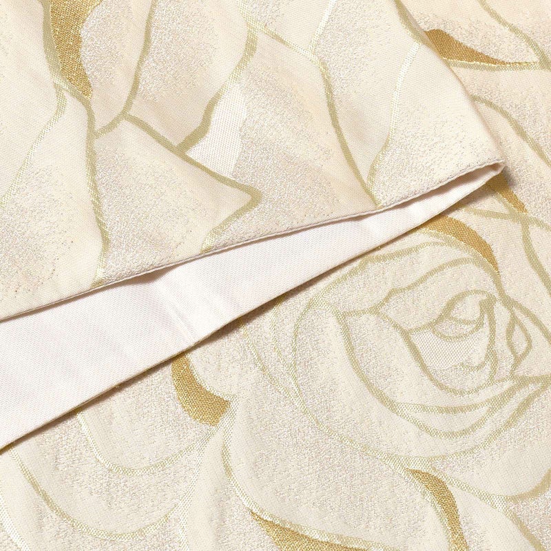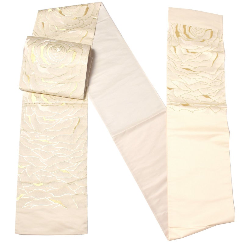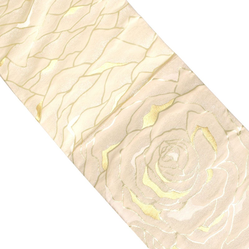 【色柄】アイボリー地にゴールドの輪郭線で表現された大輪のバラの花。ポイントにゴールド、シルバー、シルバーのぼかしの入った花びらの重なりが、波のように全体に織り出されています。