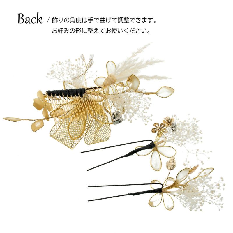A.金:ゴールドのワイヤーに半透明のゴールドや白の樹脂の膜を張ったディップフラワー、白のプリザーブドフラワーのカスミソウや穂、ゴールドのメタルフラワー、パールビーズやラインストーン、金のチュールリボンを組み合わせたコーム1点。ディップフラワーにカスミソウ、メタルパーツの花や葉を組み合わせたUピン2点。