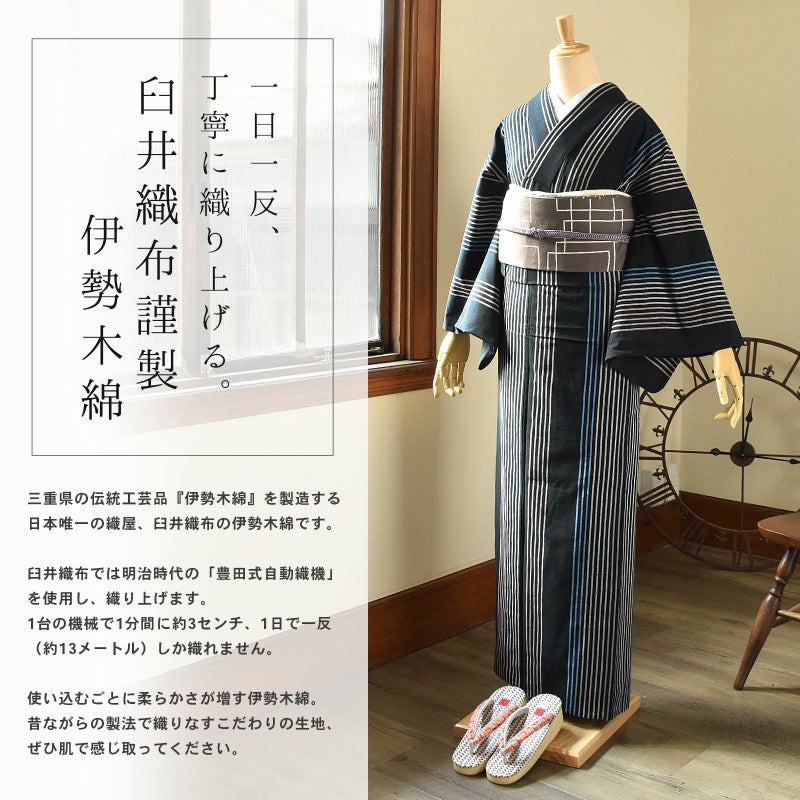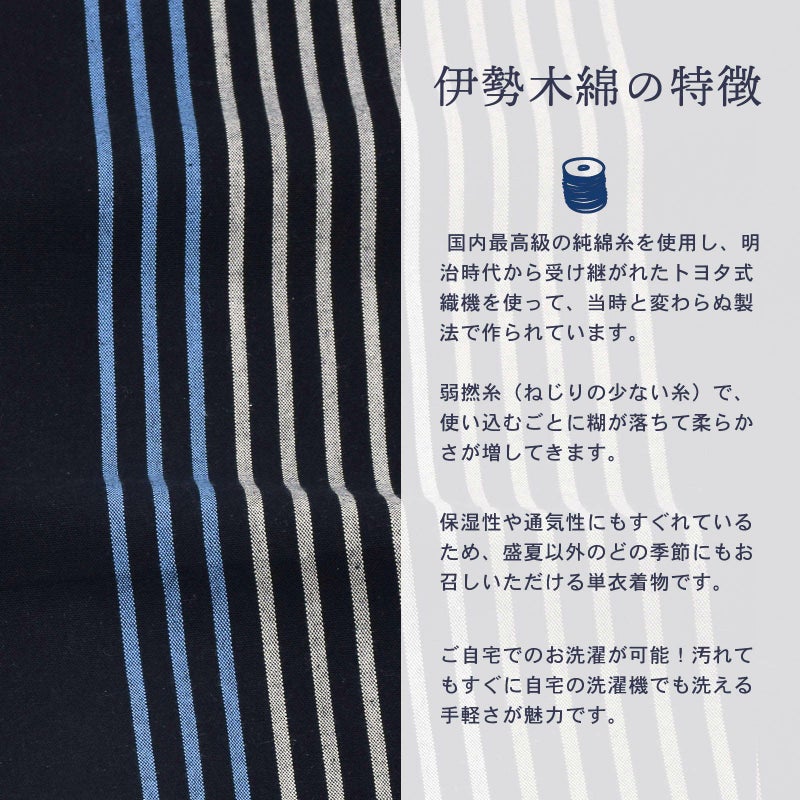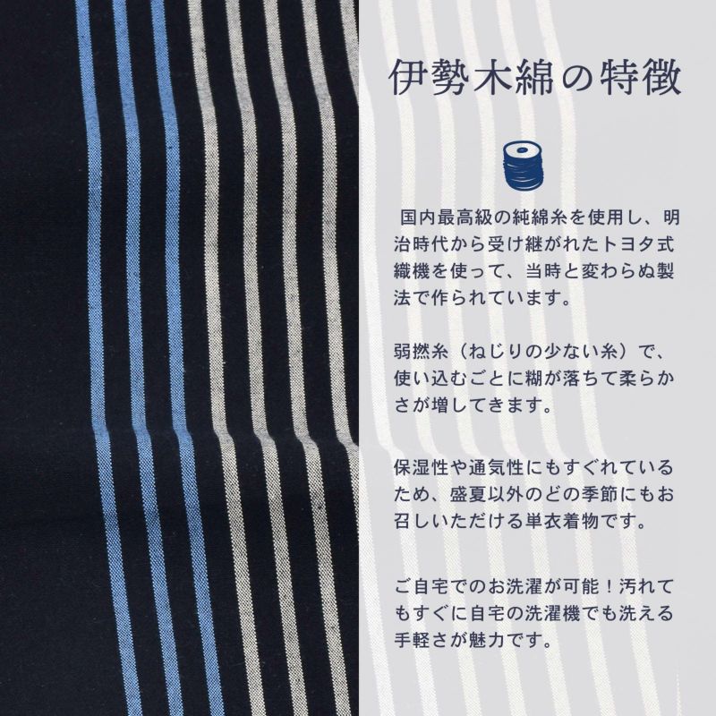 着物は単衣(ひとえ)仕立てですが、伊勢木綿は保湿・通気性にも優れているので、盛夏や真冬を除いて通年ご着用いただけます。