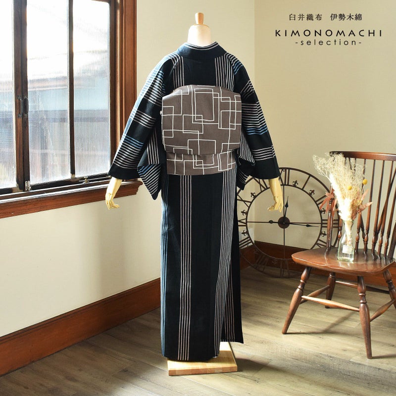 伊勢木綿 洗える着物 単品「縞 黒地、洗柿×白×薄青」お仕立て上がり 木綿きもの 日本製 三重県 伝統工芸品 単衣 綿 カジュアル チェック 小紋 レディース キモノ kimono