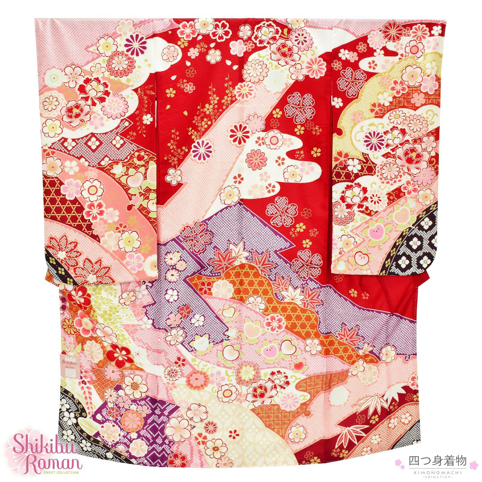 着物は赤地に浅い赤茶や紫、桃色、黒などで松菱取りや道長、雲取り、雪輪取りなど色々な取り方を組み合わせた文様取り。中は疋田や籠目、七宝など。その上に赤やピンクを基調とした梅菊、桜楓や橘、楓に金茶色の枝梅などの花紋が散らされています。ポイントに金糸の刺繍。重ね衿は白。薄ピンクの長襦袢。
