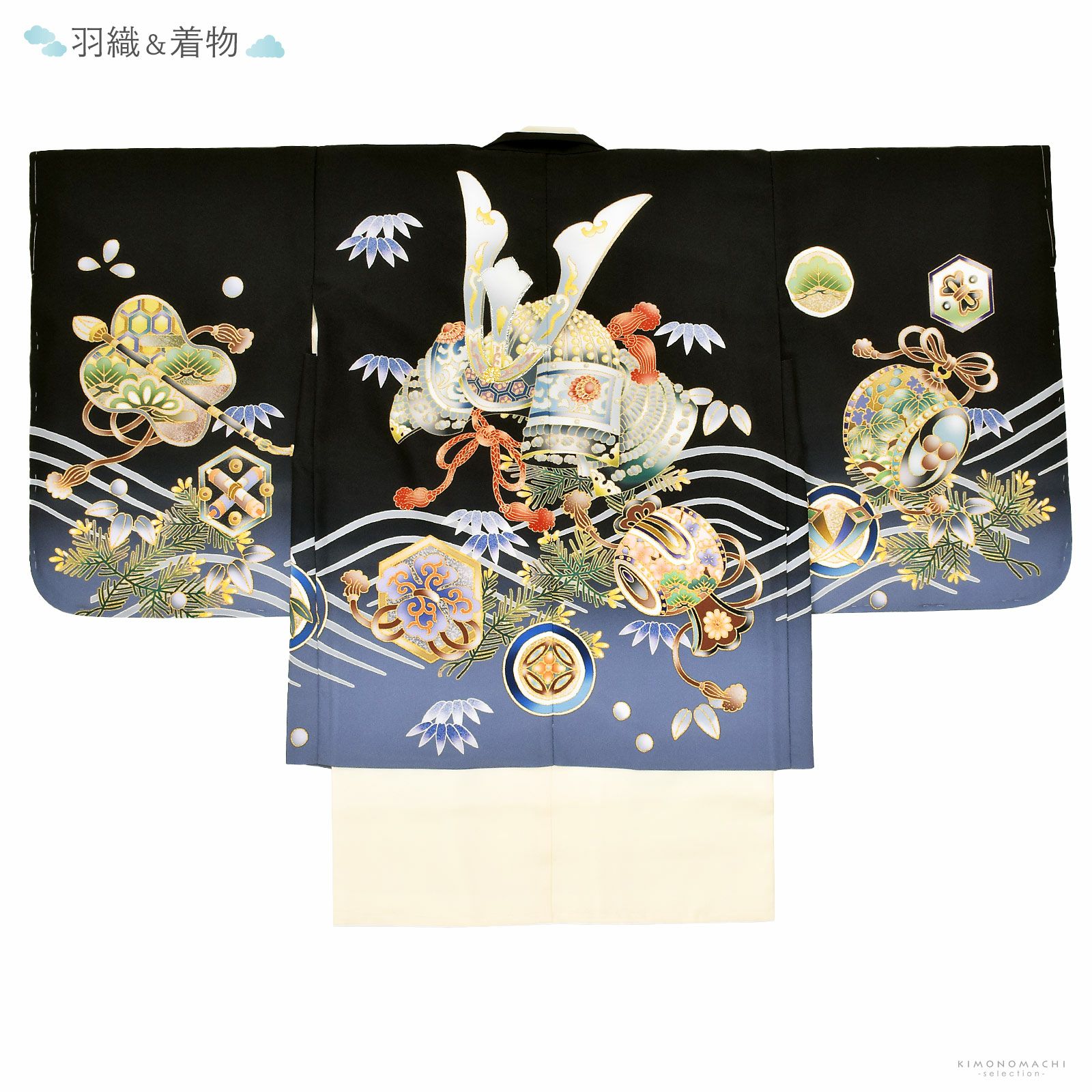 【色柄】羽織は黒地にやや青紫みのグレーの裾ぼかし。グレーの波に深緑色の若松、青紫色の笹紋。背には白やグレー、青灰色、緑の兜に赤茶の組紐。ポイントに金銀の刺繍が威風と煌びやかさを添えます。袖などに小槌や軍配、宝尽くし紋。着物はアイボリー。白の襦袢がついています。