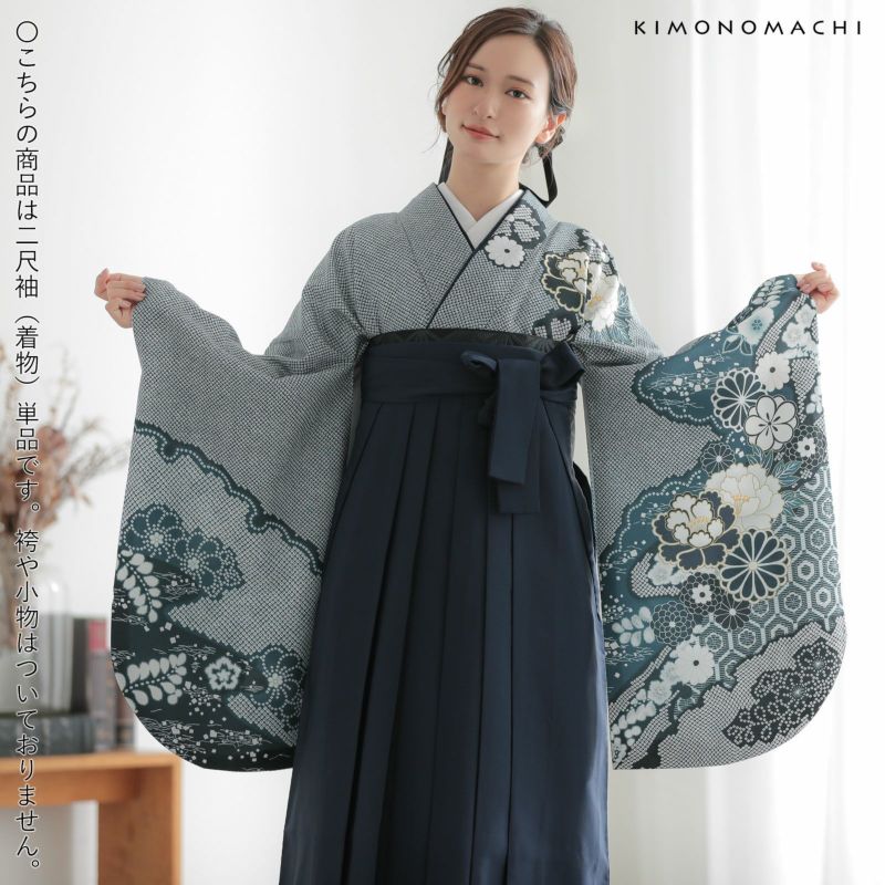 お仕立て上がり二尺袖着物です。ポリエステル素材ですので、お洗濯も簡単で、お手入れが楽ちんです。袴と合わせて卒業式、謝恩会などに。袖が長く、華やかな雰囲気です。着物の丈は、袴が着付けやすいように、短い丈になっています。
