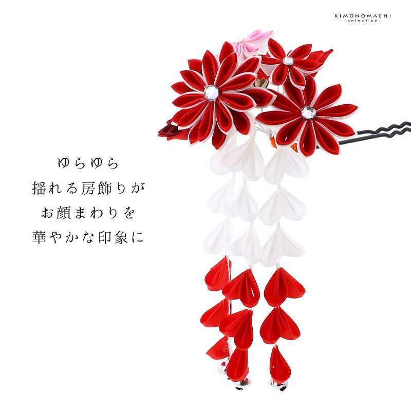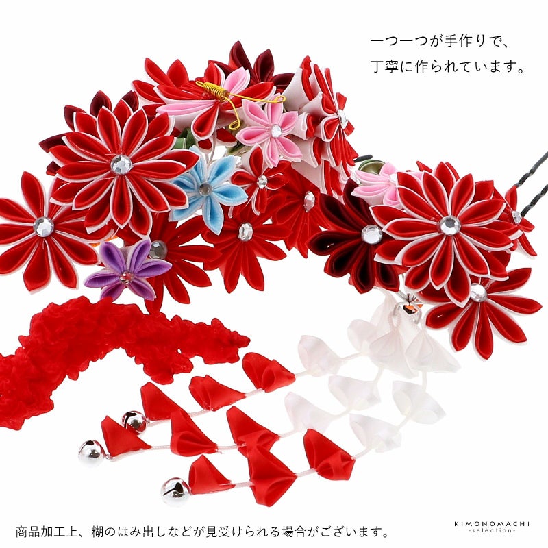 ◇かんざしの足は、お子様の頭に沿うように曲げてご使用ください。また、お花、房飾り、ビラカン等のパーツは多少動かせますので、髪型に合わせて調整してください。
