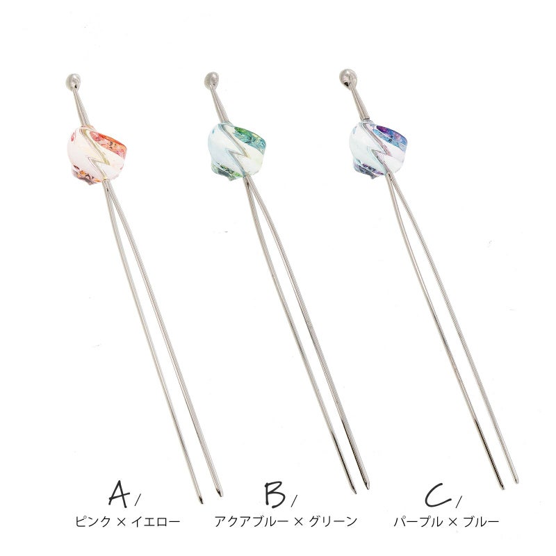 B.アクアブルー×グリーン:ねじったような形の玉飾りは、透明な明るい水色と黄緑色のバイカラー。簪部分はシルバー