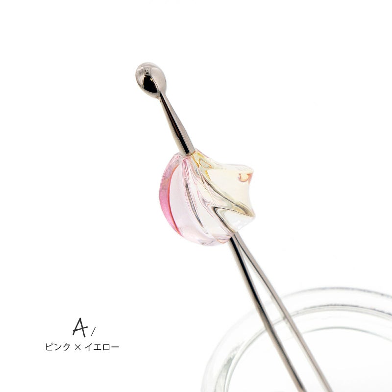 A.ピンク×イエロー:ねじったような形の玉飾りは、透明なピンクとイエローのバイカラー。簪部分はシルバー