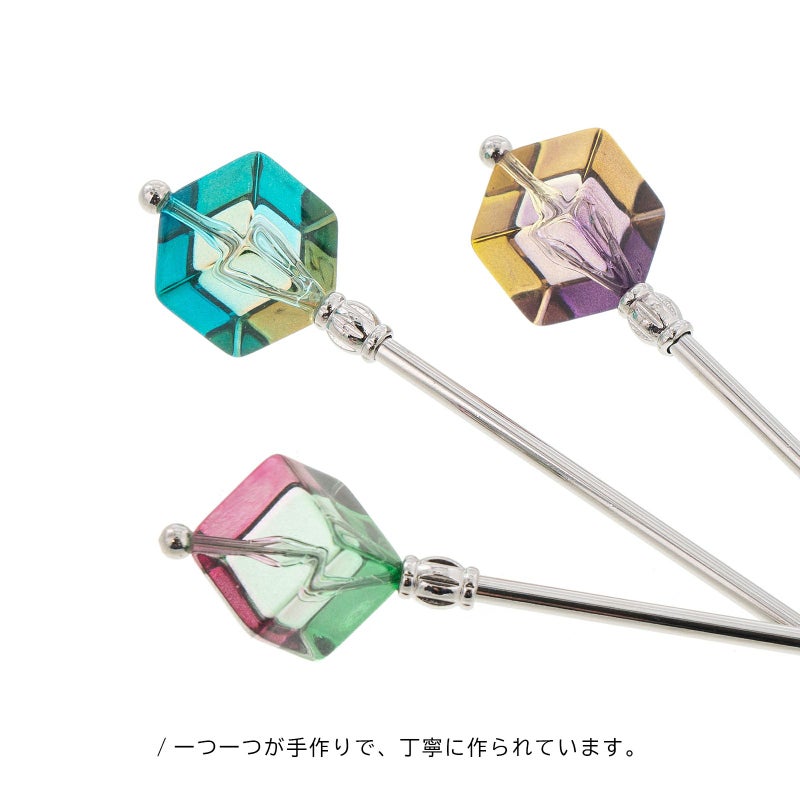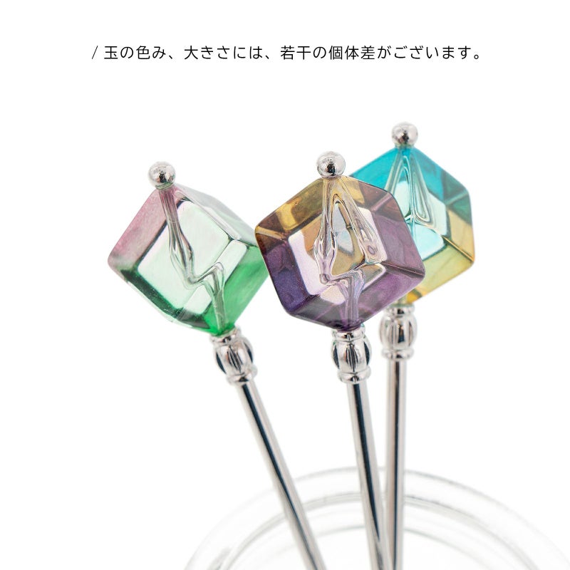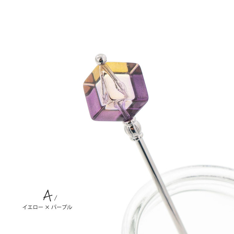A.イエロー×パープル:透明なキューブの飾りは、シトリンのようなイエローとアメジストのようなパープルのバイカラー。簪部分はシルバー