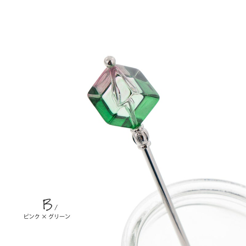 B.ピンク×グリーン:透明なキューブの飾りは、トルマリンのようなピンクとグリーンのバイカラー。簪部分はシルバー