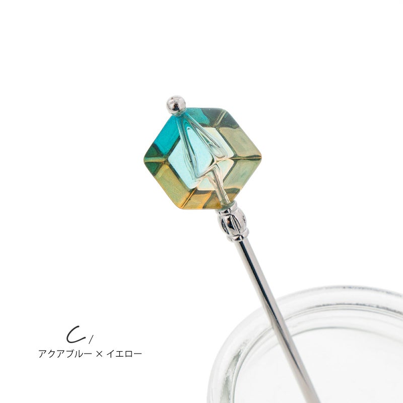 C.アクアブルー×イエロー:透明なキューブの飾りは、トパーズのような明るいブルーとイエローのバイカラー。簪部分はシルバー