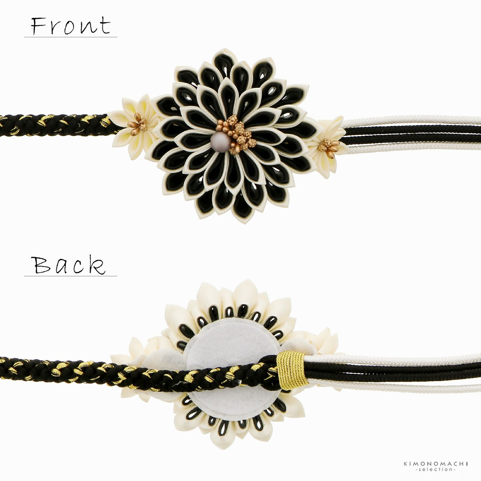 A.ブラック:黒を基調としてゴールドが入った丸組。つまみの飾りを挟んで、4本に分かれた白と黒の細い組紐。つまみの飾りは、外側がアイボリー、内側が黒の二重剣つまみの菊の花。中央にブロンズゴールドのペップ、マットなグレーのビーズ。両側にアイボリーの小さな剣菊。