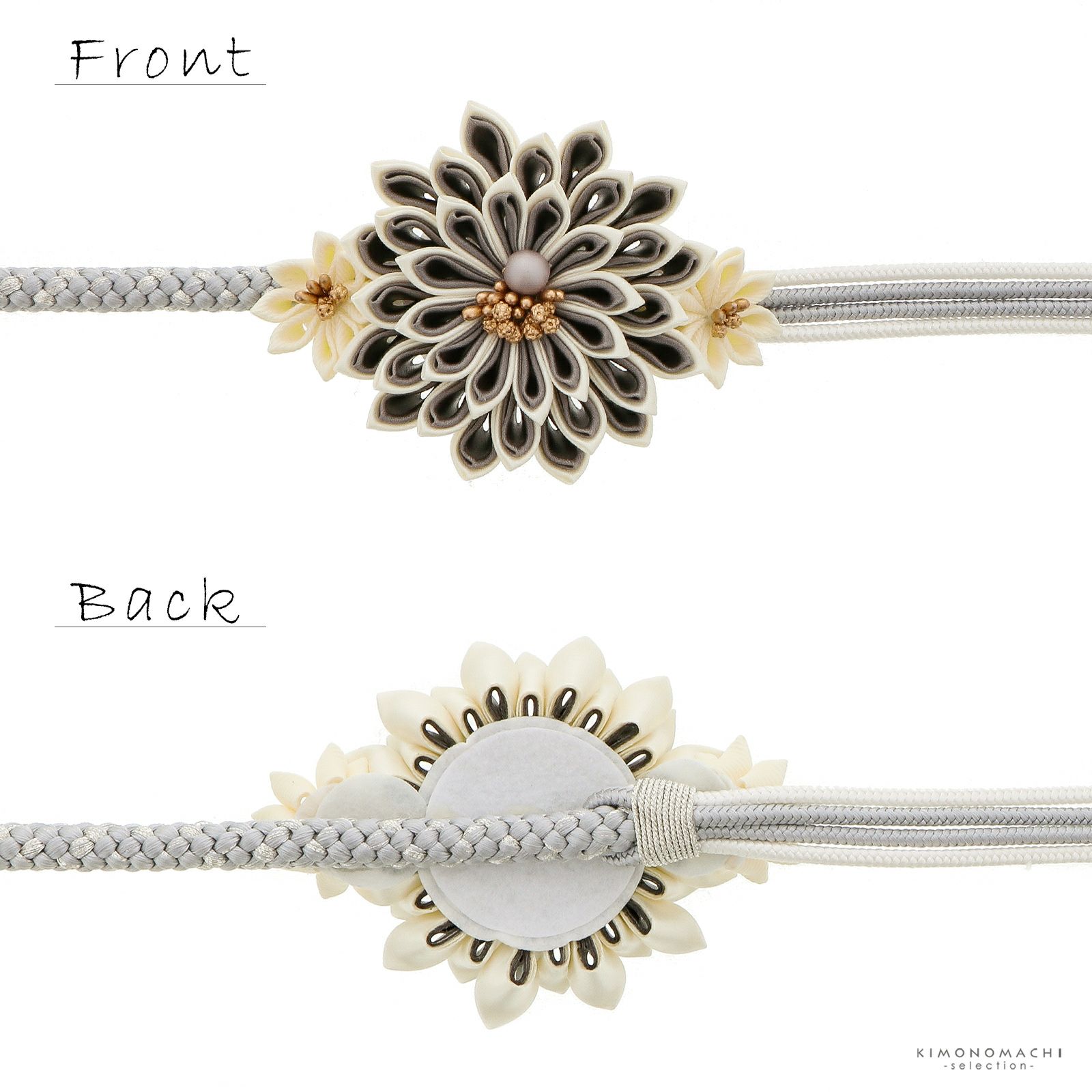 B.グレー:淡いグレーを基調としてシルバーが入った丸組。つまみの飾りを挟んで、4本に分かれた白と淡いグレーの細い組紐。つまみの飾りは、外側がアイボリー、内側がグレーの二重剣つまみの菊の花。中央にブロンズゴールドのペップ、マットなグレーのビーズ。両側にアイボリーの小さな剣菊。