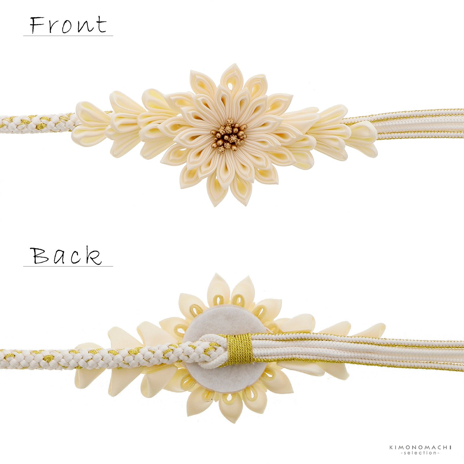 C.アイボリー:白を基調としてゴールドが入った丸組。つまみの飾りを挟んで、4本に分かれた白とゴールドの細い組紐。つまみの飾りは、アイボリーの二重剣つまみの菊の花。中央にブロンズゴールド。菊の両側にアイボリーのつまみの花びら飾り。