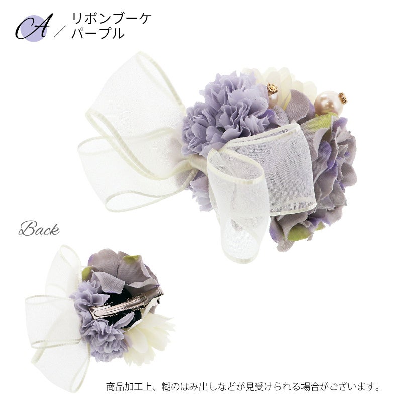 A.リボンブーケ パープル…グレイッシュなパープルに黄緑の挿し色のお花、淡い青紫色、白のマム、パールビーズ、オフホワイトのリボン。